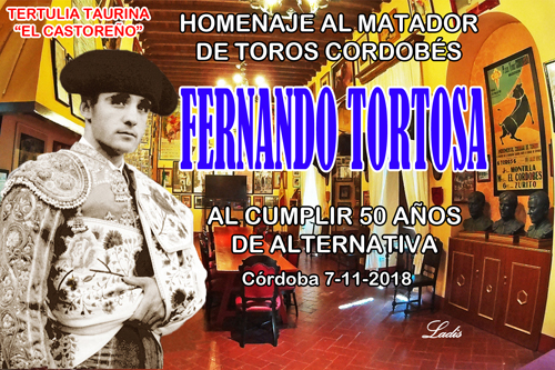 La tertulia taurina El Castoreño ha rendido un cariñoso homenaje al matador de toros cordobés Fernando Tortosa en el 50 aniversario de su alternativa. Fue un acto muy emotivo que comenzó con la entrada al salón Liceo del homenajeado flanqueado por matadores de toros cordobeses mientras la banda musical del Cristo del Amor interpretaba el pasodoble taurino que le dedicó el maestro egabrense José Rodríguez.