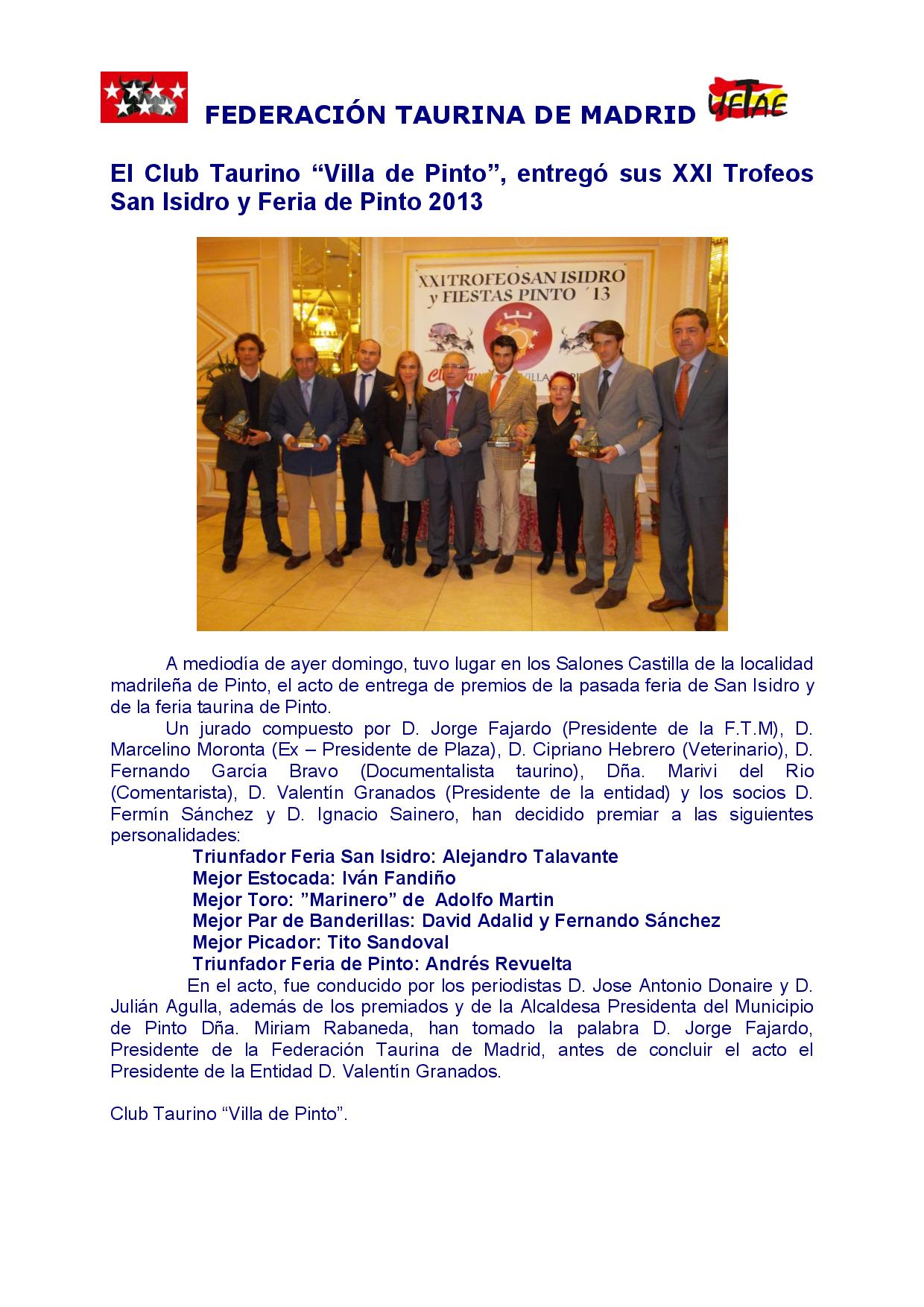 El Club Taurino Villa de Pinto, entregó sus XXI Trofeos San Isidro y Feria de Pinto 2013
