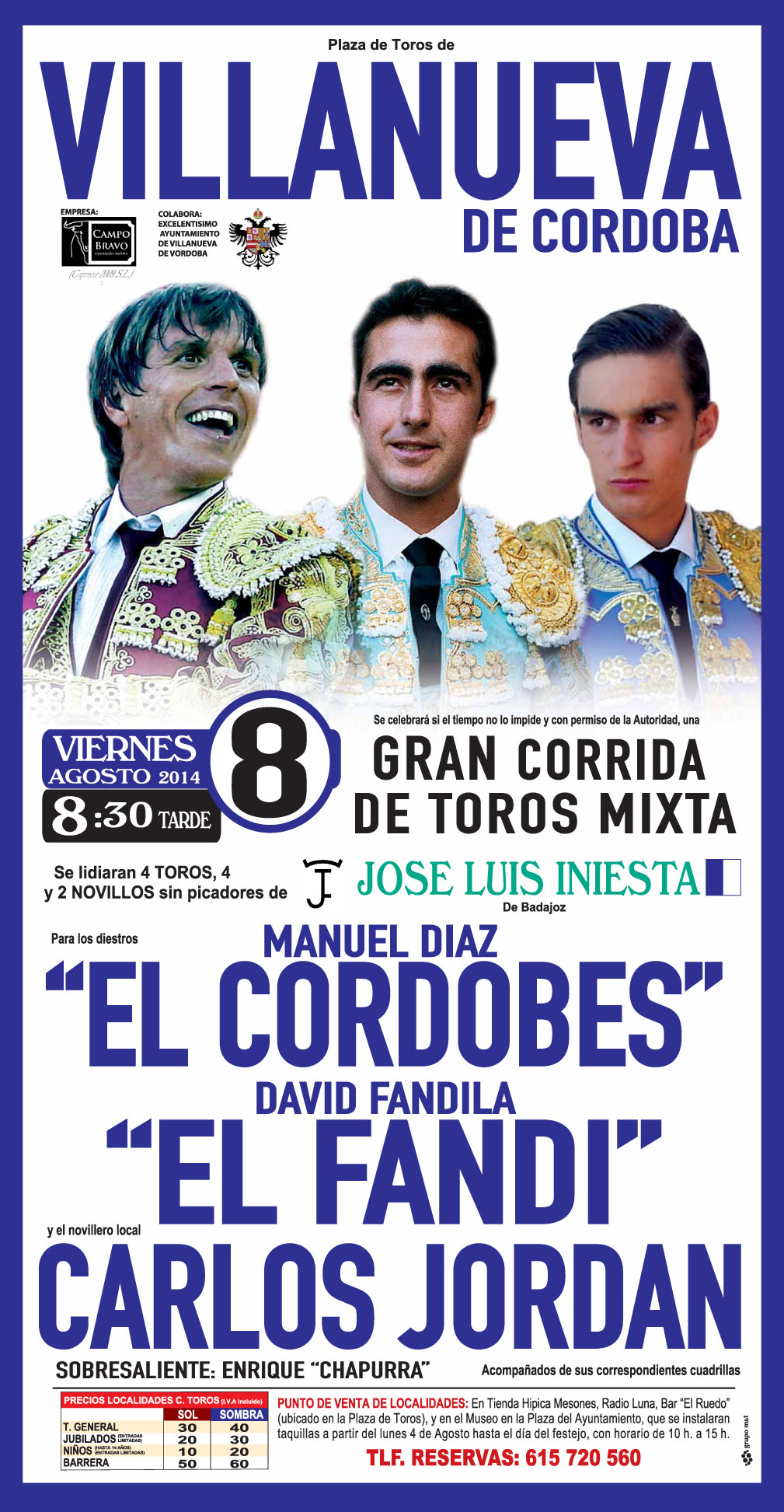 A partir de las ocho y media de la noche, harán el paseíllo, Manuel Díaz ‘El Cordobés’, David Fandila ‘El Fandi’, y el novillero sin picadores de la tierra, alumno de la Escuela Taurina del Círculo Taurino de Córdoba, Carlos Jordán. Lidiarán, cuatro toros y dos erales de la ganadería de, José Luis Iniesta, respectivamente.