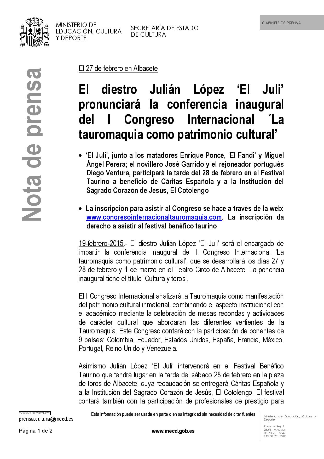 El diestro Julián López ‘El Juli’ pronunciará la conferencia inaugural del I Congreso Internacional ´La tauromaquia como patrimonio cultural’