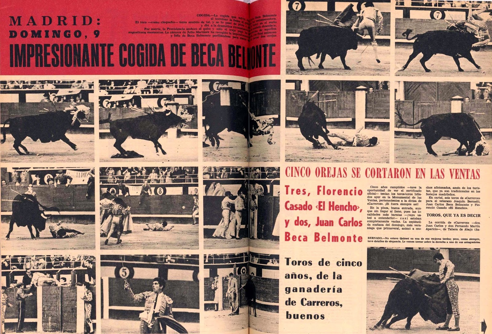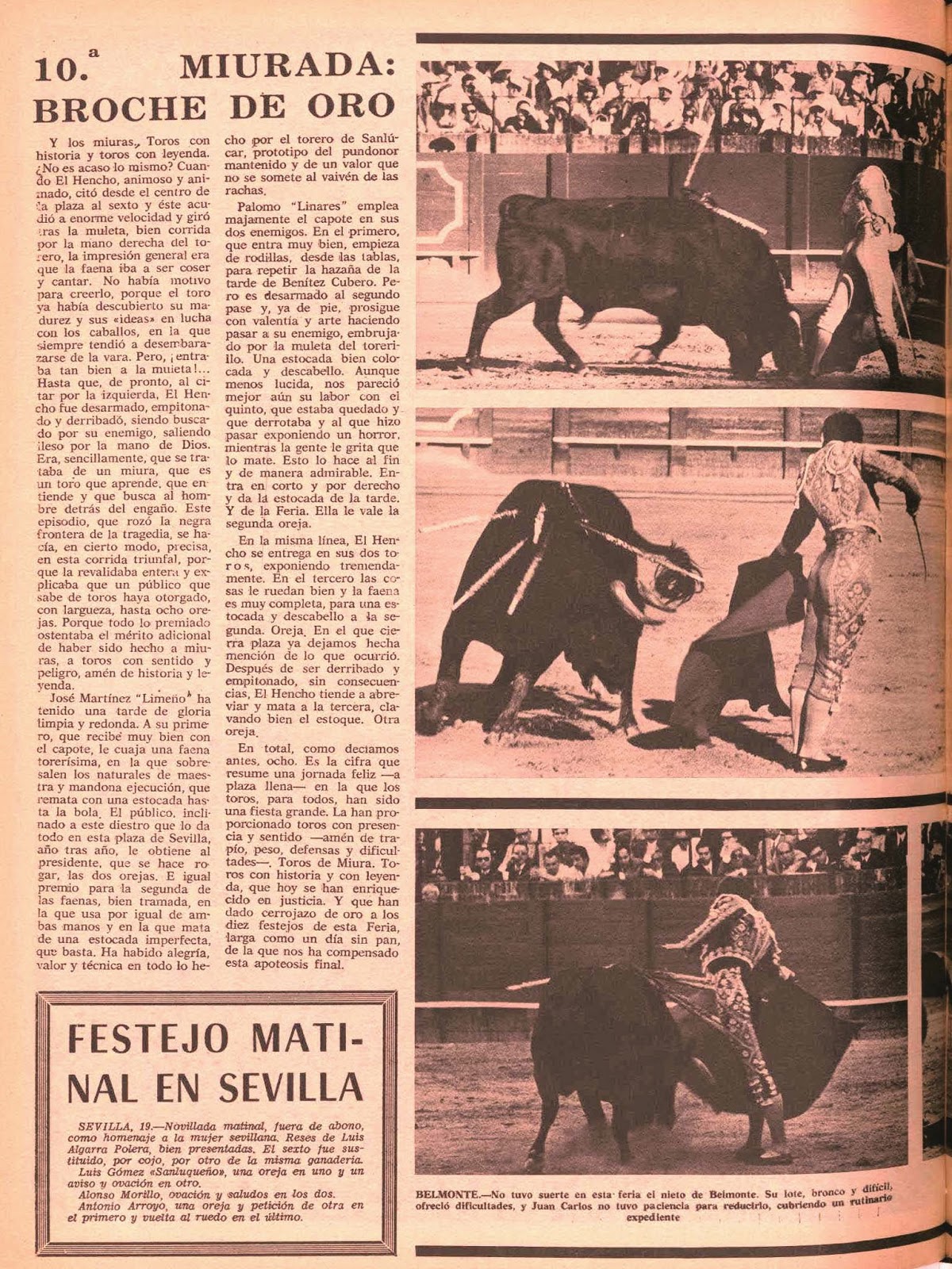 Mas de veinte años como matador de toros y aproximadamente unas ciento sesenta corridas toreadas, es el historial que avala a un torero que tuvo que ganarse todas las tardes en el ruedo el ansiado contrato a costa, muchas veces, de teñir con su propia sangre el amarillo albero de las plazas. Ahí quedan como claros ejemplos las tres cornadas que recibió en Venezuela, Madrid y Francia las tres de pronóstico grave. Percances durísimos, serios e importantes que, a veces, hacen dudar a cualquier torero pero que a él ni la afectó ni mermó un ápice a su toreo valiente y honesto. “La de Madrid fue gordísima me metió el pitón por el bajo vientre y me echó las tripas fuera -dice con un ligero y velado orgullo el valiente torero- que sin duda, en su vida taurina pasaría por momento más agradables y felices. ¡Claro que sí! en mi memoria siempre estará presente la tarde de los Miuras en Sevilla el día 10 de abril de 1970, junto a ”Limeño” y “Palomo Linares”. “Recuerdo que me vestí ese día de torero sin tener un contrato firmado y me la jugué de verdad. Al toro le hice una lidia completa. Lo toree muy despacito y le dí todas las ventajas para poder lucirlo,” comenta lleno de satisfacción el maestro. “Al final le corté las dos orejas y salí a hombros por la Puerta del Príncipe. Seguidamente aclara, “Ahora se necesitan tres para cruzar a hombros esa misma puerta”.