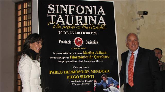 2.jpgEl 29 de enero a las 8 de la tarde tendrá lugar la corrida de la Sinfonía taurina que tendrá el prólogo de un concierto con la presentación de la Soprano queretana Martha Juliana, acompañada por la Filarmónica de Querétaro dirigida por el maestro José Guadalupe Flores. En la parte taurina harán el paseíllo en la lidia de 2 novillos de Xajay y dos toros de Pepe Garfias el novillero Diego Silveti y el maestro del  rejoneo Pablo Hermoso de Mendoza que actuarán en este festejo benéfico a favor del DIF municipal cuya presidenta honoraria, la Sra. Sandra Albarrán de Calzada, es una gran aficionada. Los fondos que se recauden serán destinados para la realización de  un Centro de Día para personas de la tercera edad en el municipio de Landa de Matamoros, en la sierra queretana.