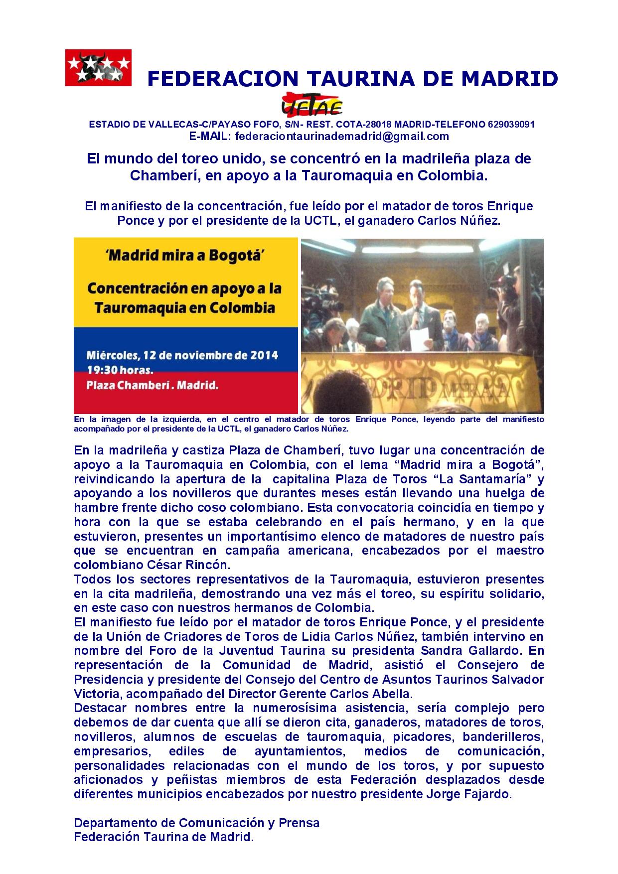 El mundo del toreo unido, se concentró en la madrileña plaza de Chamberí, en apoyo a la Tauromaquia en Colombia