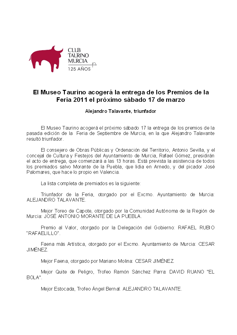 El Museo Taurino acogerá la entrega de los Premios de la Feria 2011 el próximo sábado 17 de marzo