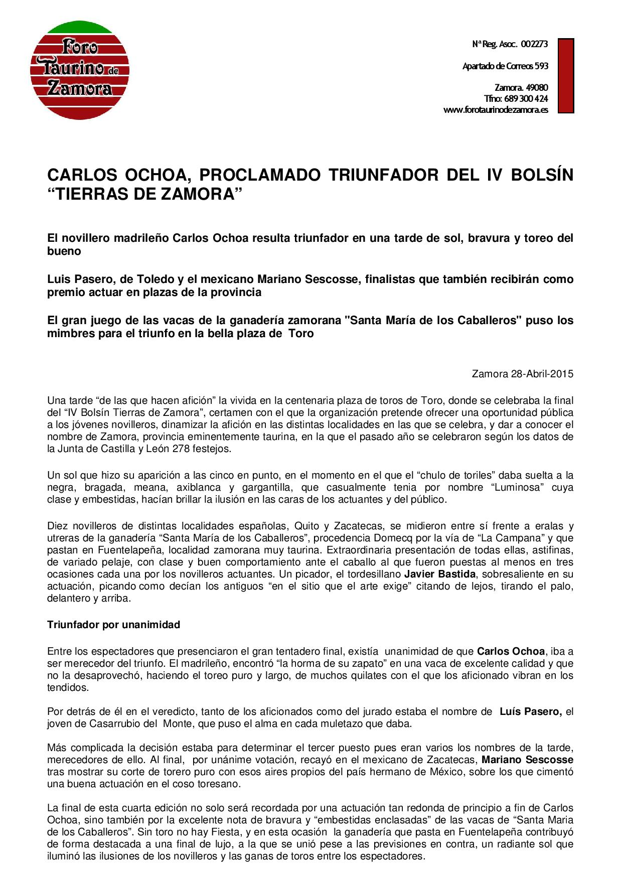 El novillero madrileño Carlos Ochoa, triunfador del IV Bolsín Tierras de Zamora
