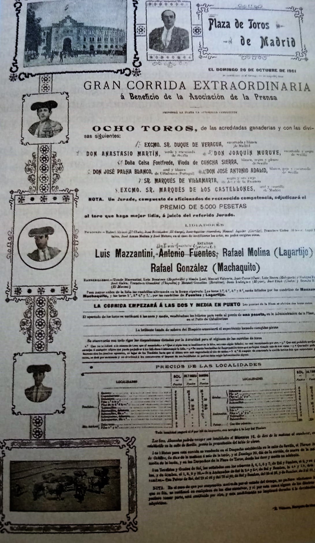 Acabada la fiesta y de regreso a Madrid, los responsables de la organización del evento se pusieron manos a la obra. Eligieron ocho toros del marqués de Saltillo, para cuatro ases de la torería a la sazón: Luís Mazzantini, Antonio Fuentes, Emilio Torres “Bombita» y José García “Algabeño».