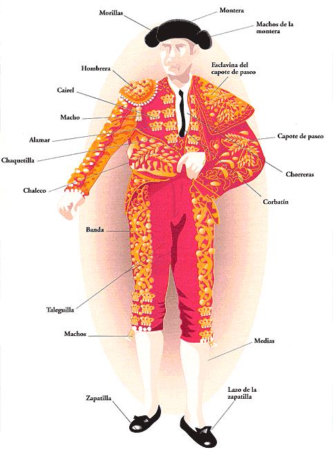 La historia nos dice que fue “Costillares” quien diseñó los primeros vestidos de torear. Es una vestimenta tradicional que procede de finales del siglo XVII y que se le fueron añadiendo numerosos complementos, hasta la fecha es una ropa exclusiva para ejercer de torero o subalterno. Está fabricado en seda bordado de oro, plata o azabache. Vestirse de torero es un ritual para el matador, que es asistido en todo momento por su mozo de espadas, que le ayuda a vestirse con especial parsimonia y orden.