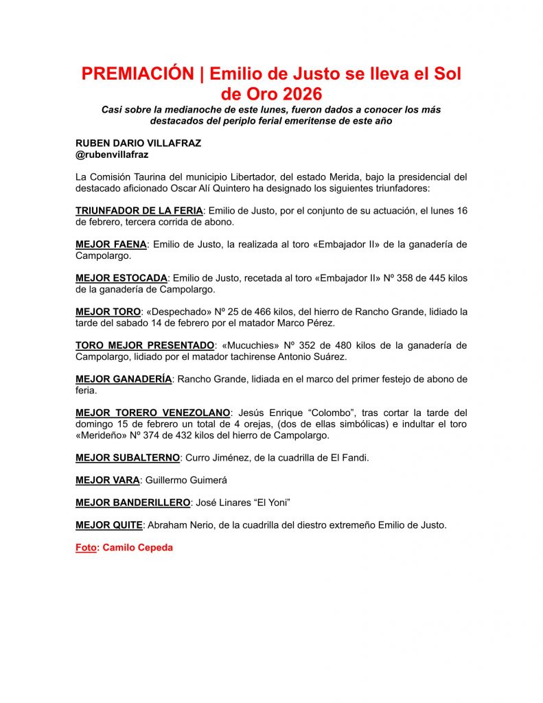 Emilio de Justo se lleva el Sol de Oro 2026 – Para + info haz clic👆 🇪🇸