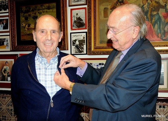 Continuó el presidente señalando los motivos por los que fue propuesto don Agustín Montes para el homenaje, una propuesta que se aceptó de forma unánime ya que ha conseguido como ganadero situarse en un lugar de privilegio habiendo obtenido numerosos y señalados triunfos en plazas muy importantes por toda la geografía desde que tomó antigüedad en Madrid, con divisa rojo y verde, el 29 de abril del año 2006 lidiando una novillada que dio buen juego; Benjamín Gómez cortó la oreja del cuarto ejemplar. Destacó el gran encierro que se lidió en la corrida de la Comunidad de Madrid, el 2 de mayo del 2015 con triunfos memorables de López Simón y Morenito de Aranda que salieron por la puerta grande. De bandera resultó el toro Caparrota-62 premiado con la vuelta al ruedo en Miraflores de la Sierra con el que “Finito de Córdoba”, que le cortó las dos orejas, dictó una lección de tauromaquia, tal vez una de las mejores faenas de su carrera. Otro hito fue el de la novillada de Guadarrama del 3 de octubre del 2010. No quiso extenderse más pues en la citación para el acto se daban pormenores de la trayectoria. Terminó don Felipe Díaz Murillo imponiendo a don Agustín Montes Díaz el “Madroño de albero”, emblema y distintivo de la Tertulia de Amigos del Conde de Colombí. También le fue entregada una fotografía enmarcada de un muletazo de Uceda Leal al toro de su ganadería con que se inauguró la plaza de Villaseca de la Sagra (Toledo).