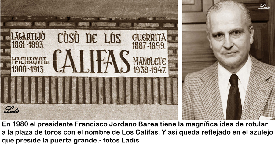 Así estuvo quince años, pues no fue hasta 1980, cuando el presidente de la Sociedad Propietaria Francisco Jordano Barea, tuvo la buena idea de bautizarla con el nombre de «Los Califas.» Y así se la conoce desde entonces en todo el orbe taurino.