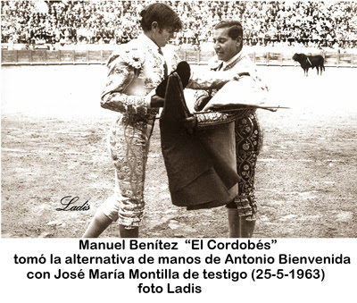 Tras frustrarse, por la lluvia, la alternativa de Manuel Benítez «El Cordobés» anunciada para el día 12 de octubre de 1962, ésta tiene lugar el 25 de mayo de 1963 con Antonio Bienvenida de padrino y José Mª Montilla de testigo.