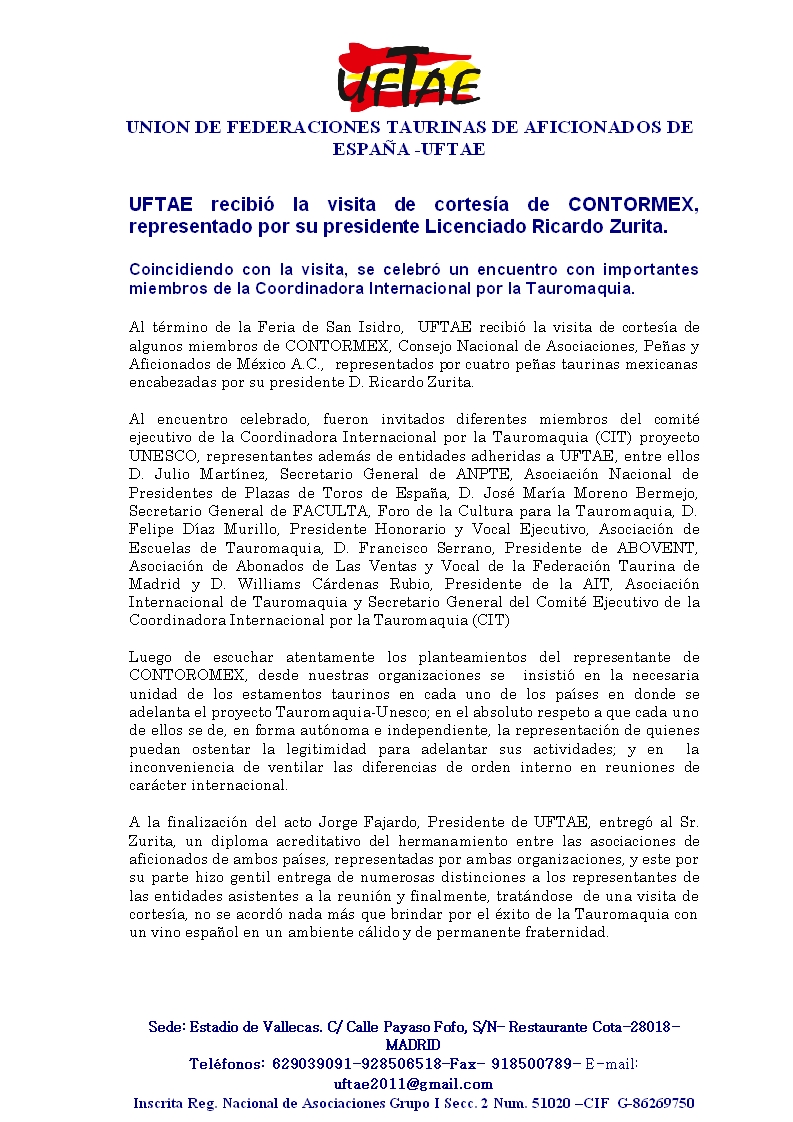 Encuentro de UFTAE y asociaciones miembros de la Coordinadora Internacional por la Tauromaquia proyecto UNESCO y CONTOROMEX