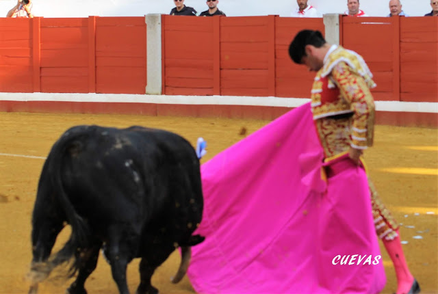 Recibió a su primer oponente cadencioasamente a la verónica. Brindó al respetable una faena que basó en la despaciosidad, toreando con la mano derecha, incluso con una tanda en redondo de rodillas, algo no muy habitual en su repertorio. Disfrutó mucho el torero y eso se apreciaba en su rostro. Mató de una estocada sin puntilla y cortó las dos orejas, quizás la segunda algo excesiva.