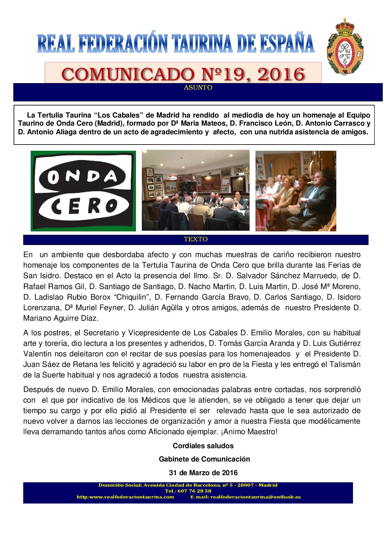 Equipo Taurino de Onda Cero (Madrid) homenajeado por la Tertulia Taurina `Los Cabales´