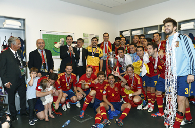Desde los Homenajes Escalera del Éxito, felicitamos a la selección española que ha hecho historia en Kiev. Un peldaño más para la Escalera del Éxito que recogió su seleccionador, Vicente del Bosque, homenajeado por nuestros homenajes el 4 de marzo de 2009. Estamos seguros que el catedrático del fútbol salmantino seguirá sumando triunfos y subiendo peldaños de su Escalera del Éxito, llevando siempre el prestigio del fútbol español a lo más alto y reconocido, en el día de hoy hemos marcado un hecho histórico: hace cuatro años Campeones de Europa, hace dos años Campeones del Mundo y por primera vez en la historia, se ha conseguido hacer triplete al conseguir volver a ser campeones de Europa (4-0 ante Italia) ayer domingo.