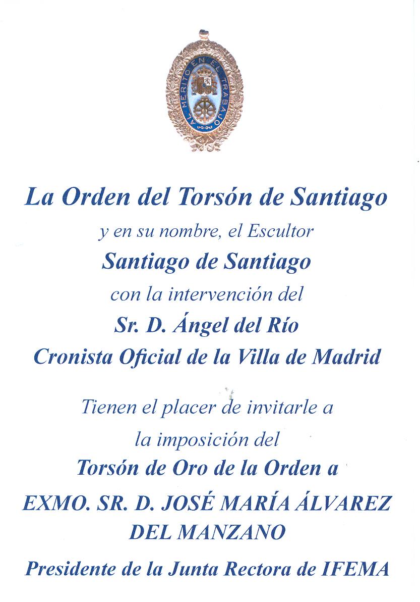 El acto se celebrará el 22 de octubre de 2014, a las 19,30 horas en el Museo del Escultor. En nombre del Escultor Santiago de Santiago (Escalera del Éxito 92),  con la intervención del  Sr. Don Ángel del Río, Cronista Oficial de la Vuilla de Madrid, procederán a la imposicion del Torsón de Oro de la Orden al Excmo. Sr. Don José  Mª Álvarez del Manzano, Presidente de la Junta Rectora de IFEMA y Escalera del Éxito 54.