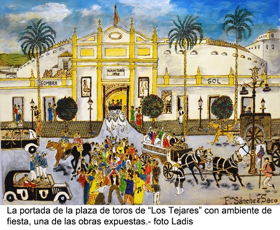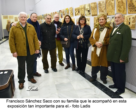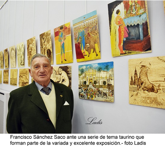 Miembro de una prestigiosa familia cordobesa vinculada al mundo del toro desde siempre (la saga de los Sánchez Saco) su profesión ha estado dividida entre el mundo de la joyería (engastador, con un libro publicado, de imprescindible lectura para quien quiera ejercer como tal) y subalterno de lujo, militando en las cuadrillas de los toreros más importantes de la segunda mitad del siglo XX (citaré solo a dos Manuel Benítez «El Cordobés» y Luis Miguel Dominguín). Y por afición artística, y buscando siempre sendas nuevas para crear, descubre el pirograbado, al que dedica buen tiempo desde su jubilación. Esta técnica requiere de mucha habilidad manual y dominio de las luces y las sombras. Francisco es un hombre de tesón, que no se rinde fácilmente, y hasta que no ha conseguido la perfección en algo, no pasa a la página siguiente. Por eso en la colección de 85 obras que muestra en esta exposición, que para él es la primera de su vida,( como dijo en las palabras que dirigió a los presentes) podemos contemplar como el encanto está presente en cada uno de sus cuadros. De tan simples son hermosos. Francisco ha huido de lo rocambolesco y ha plasmado lo que le ha gustado. Así la ciudad de Córdoba luce en sus rincones y sus edificios, como lo hacen las Imágenes de más culto para los cordobeses- la Virgen de Los Dolores es de una gran belleza-, o estampas taurinas y de caza de una veracidad asombrosa.