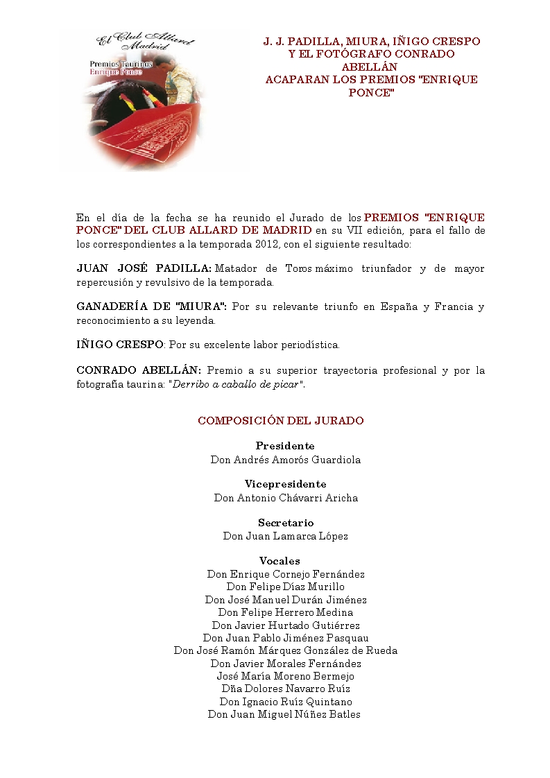 Fallados los VII Premios Enrique Ponce del Club Allard de Madrid