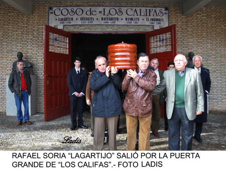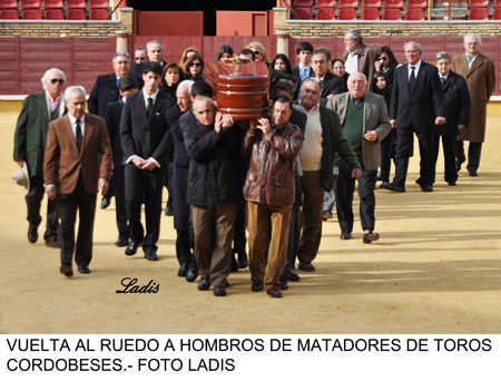 Antes de comenzar el acto religioso por el alma de Rafael Soria «Lagartijo», el coche fúnebre se desplazó hasta la plaza de toros de Los Califas para que toreros cordobeses, de los diferentes escalafones, homenajearan y despidieran con todos los honores a quien fuera su compañero y amigo. Con el féretro a hombros y acompañados de familiares y amigos, dieron una respetuosa vuelta al ruedo, tras la cual,y entre aplausos, lo sacaron por la puerta grande como colofón a toda una existencia vivida en torero. Allí, sobre el albero, junto al torero discreto y elegante que fue, vimos a los matadores de toros Manuel Rodríguez Requena, José María Montilla (Escalera del Éxito 110), Fernando Sacromonte, Manuel Cano «El Pireo», Fernando Tortosa, Gabriel de la Haba «Zurito» (Escalera del Éxito 181 – Dinastía de los «Zurito»), Agustín Parra «Parrita»,