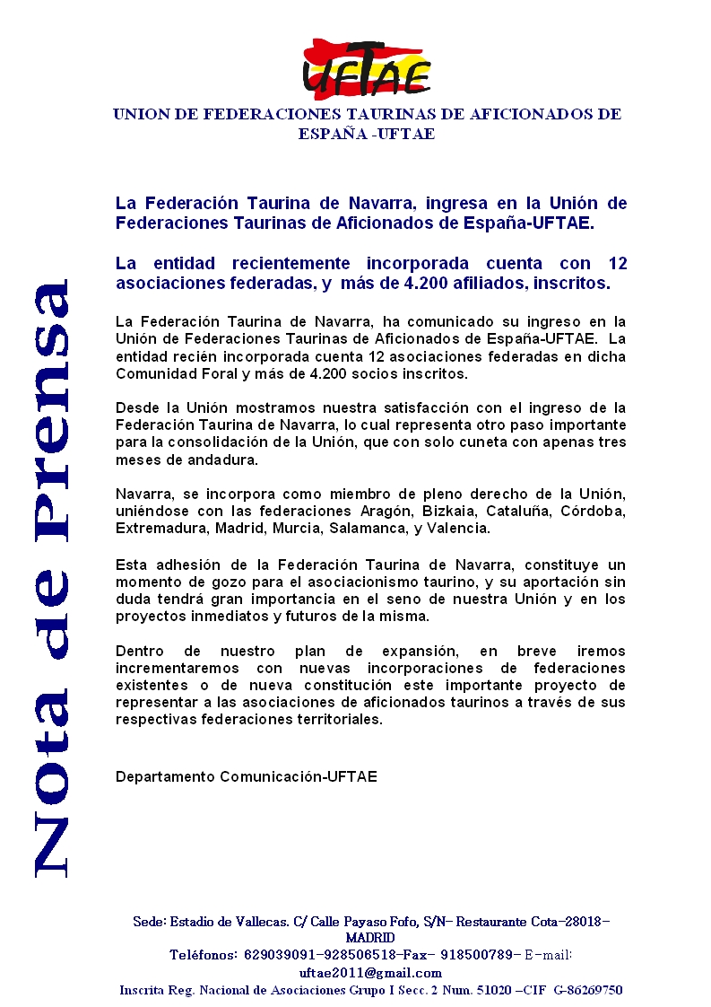 Federación Taurina de Navarra ingresa en la Unión de Federaciones Taurinas de Aficionados de España-UFTAE