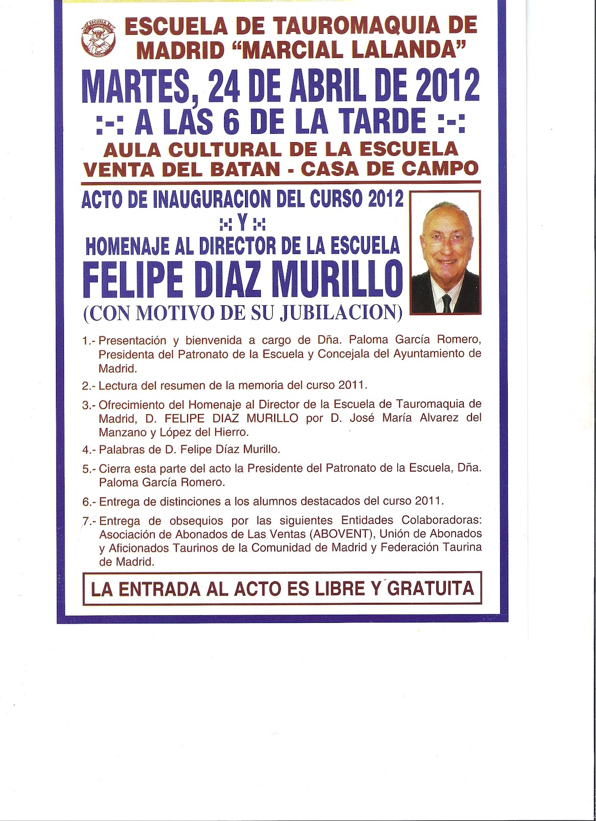 Felipe Díaz Murillo recibirá homenaje de la Escuela de Tauromaquia de Madrid