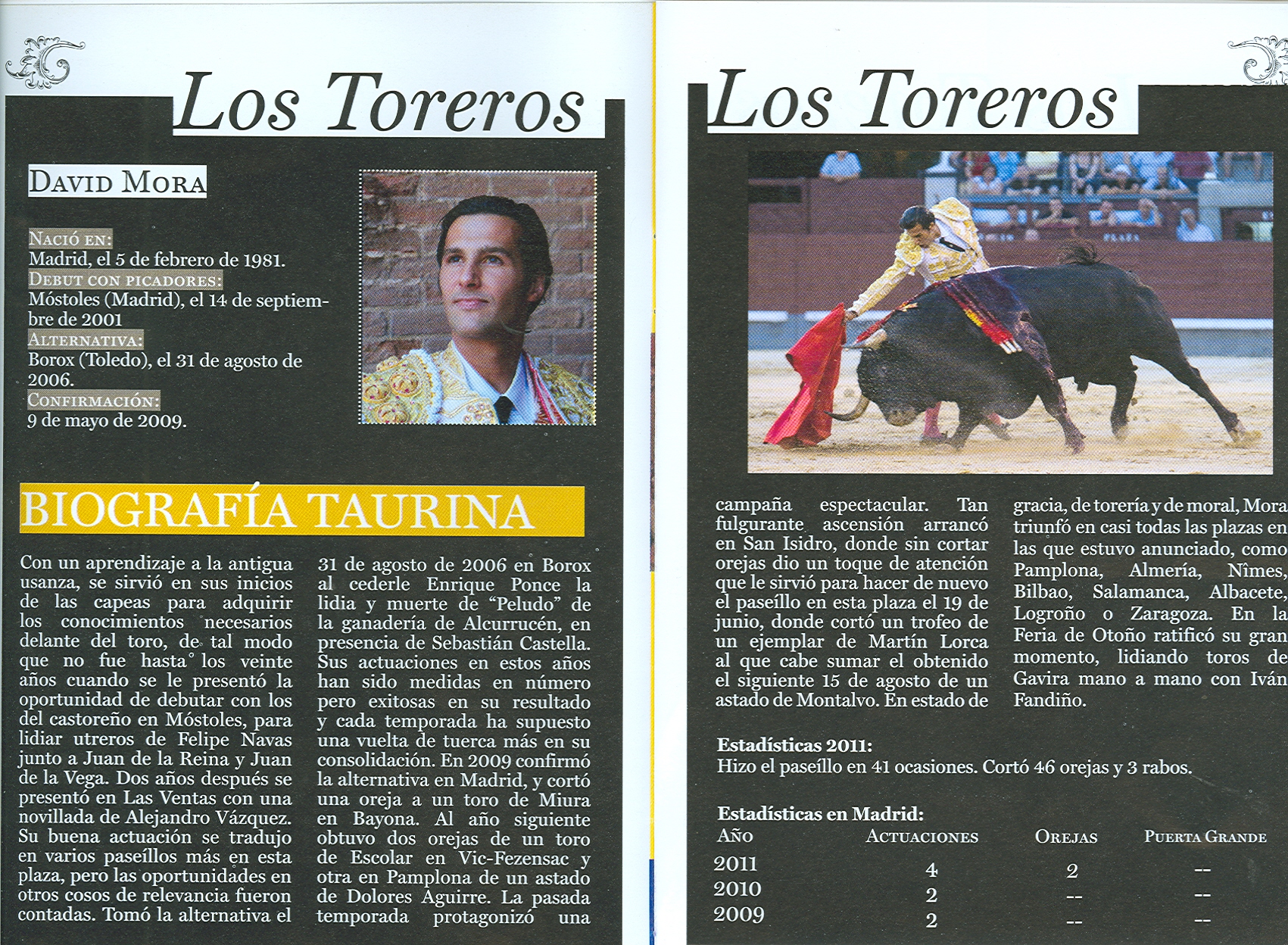 David Mora que se muestra decidido con su clase torera aunque debe cruzarse más y presentar la muleta adelantada y planchada en vez de citar con el pico, entonces su toreo alcanzará altura y más categoría. Al saludar al tercero, bordó el toreo por verónicas, se lució en chicuelinas galleando para colocar al toro en suerte ante el caballo. Un toro flojo de remos que se quedó corto de arrancada y comenzó a derrotar. Se dobló de manos y se acostó, ya no hubo nada más que hacer que pasaportarlo. Lo logró de un pinchazo, pinchazo hondo y estocada. El quinto se quitó la vara de encima y sufrió una voltereta. El diestro porfió pero no encontró respuesta en el astado que dobló de una estocada ladeada.