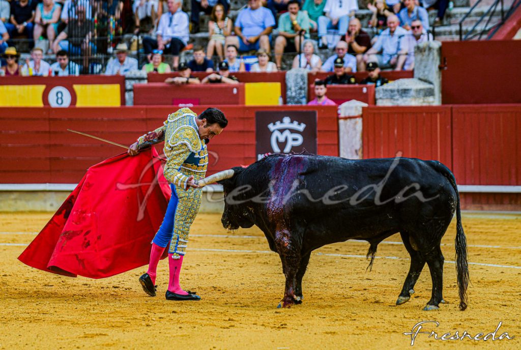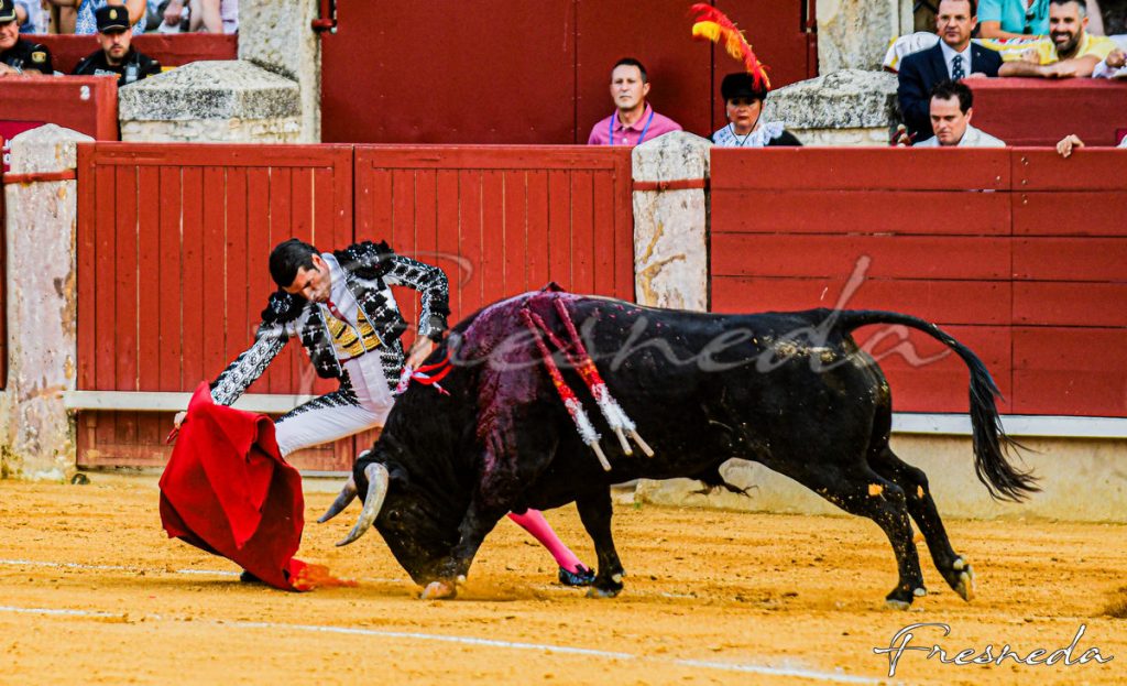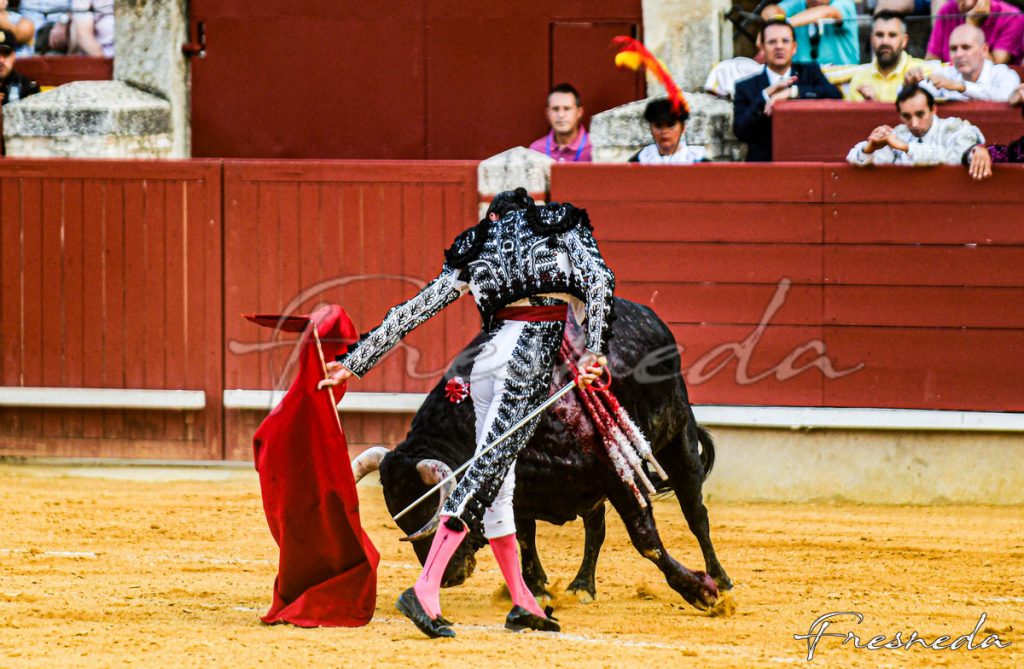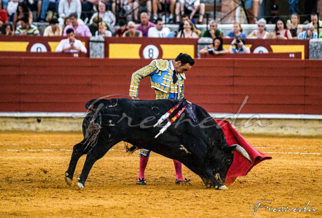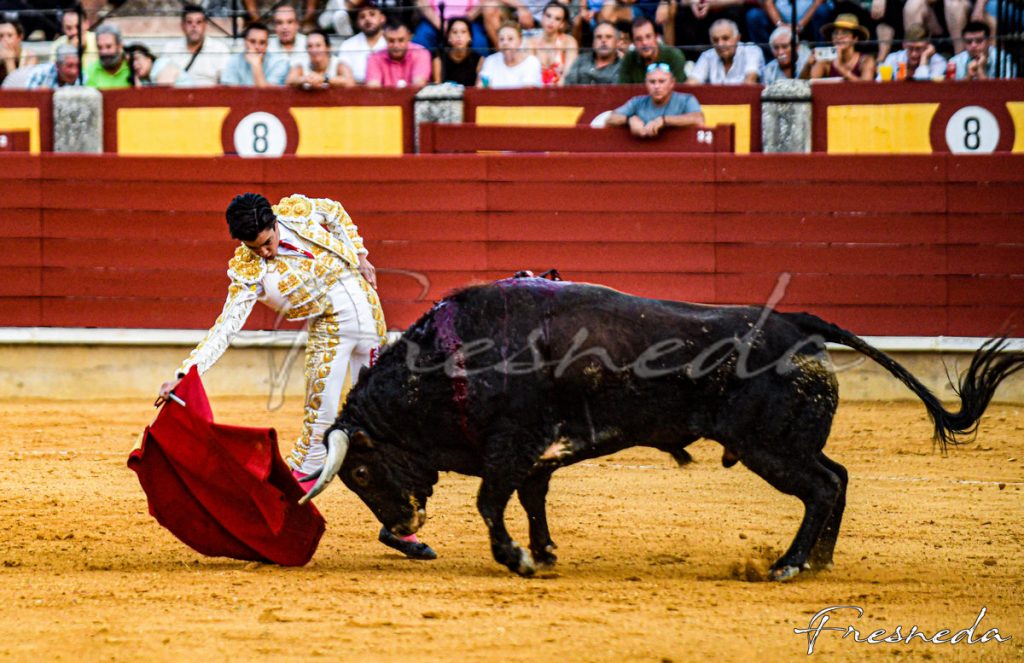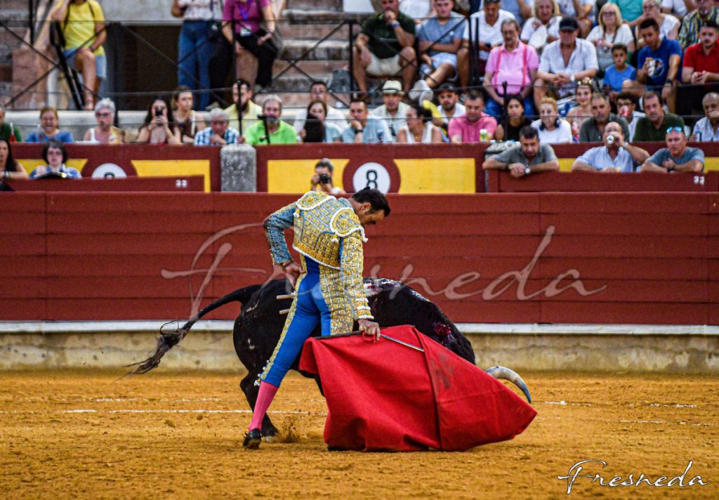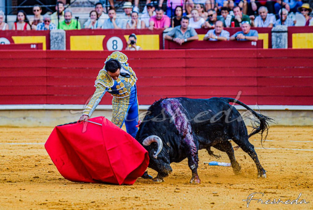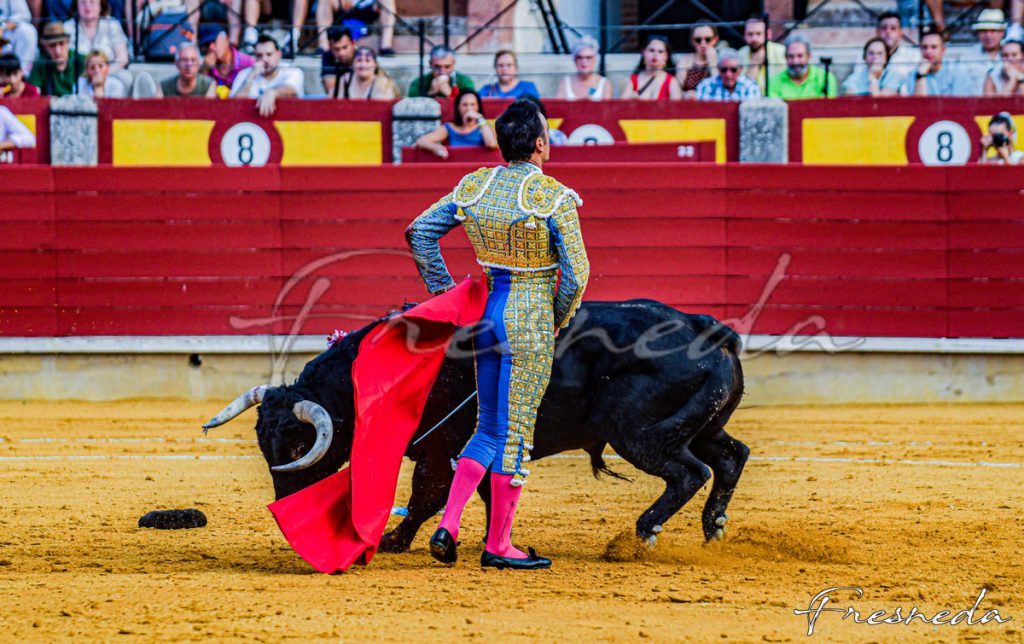 El torero extremeño le dio réplica con entrega y plasticidad hasta coger la mano izquierda y comprobar que el fuelle de su oponente había menguado notablemente. Al entrar a matar resultó cogido dramáticamente, volando por los aires pasando de pitón a pitón.