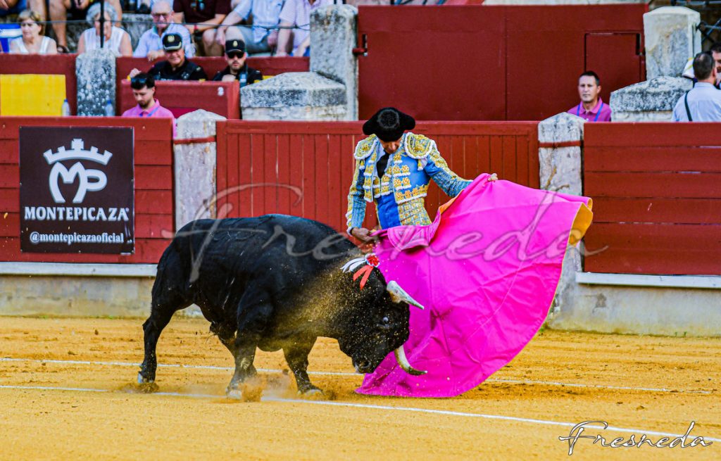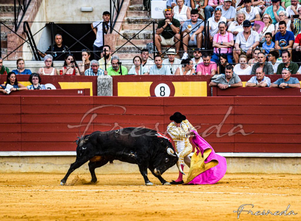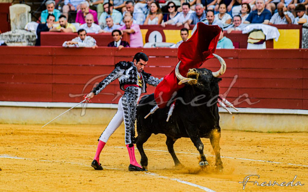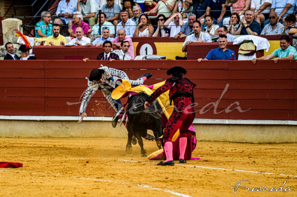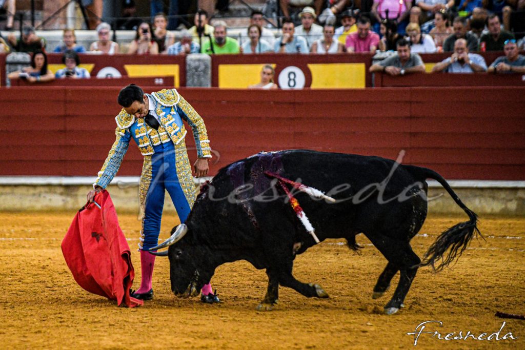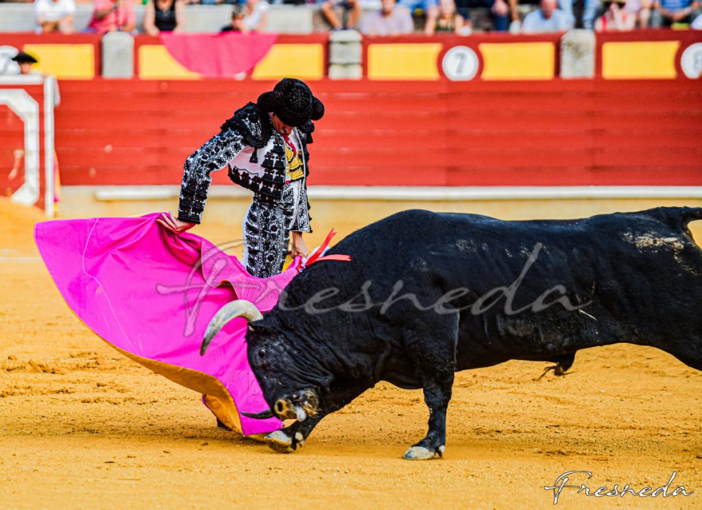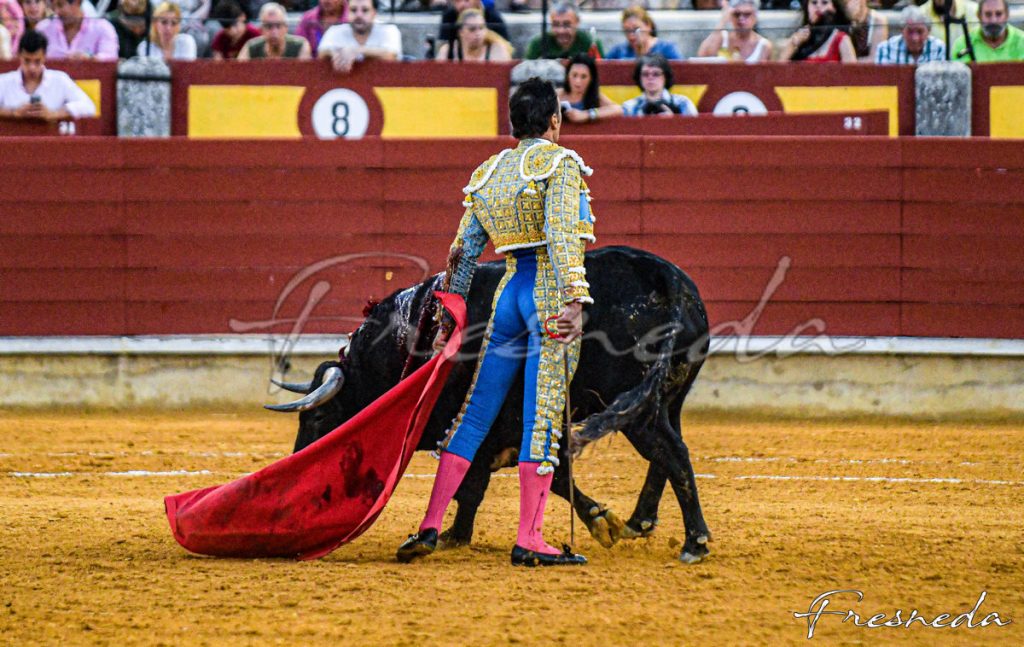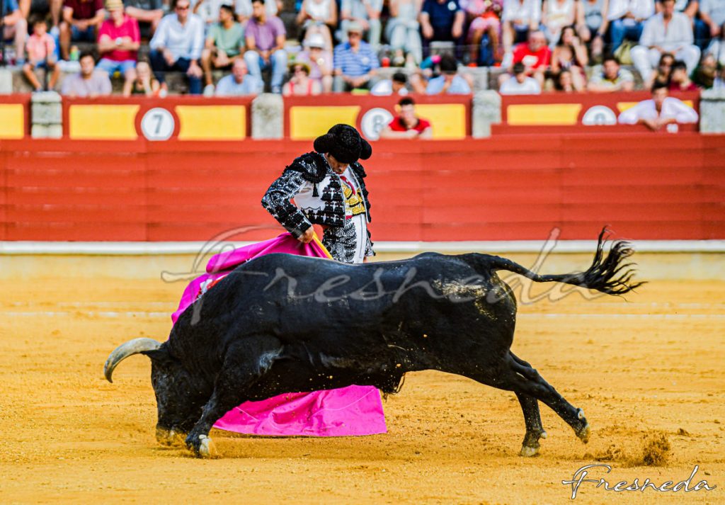 El torero extremeño le dio réplica con entrega y plasticidad hasta coger la mano izquierda y comprobar que el fuelle de su oponente había menguado notablemente. Al entrar a matar resultó cogido dramáticamente, volando por los aires pasando de pitón a pitón.