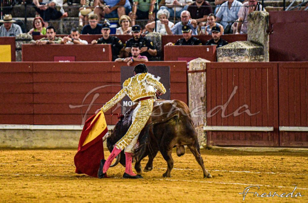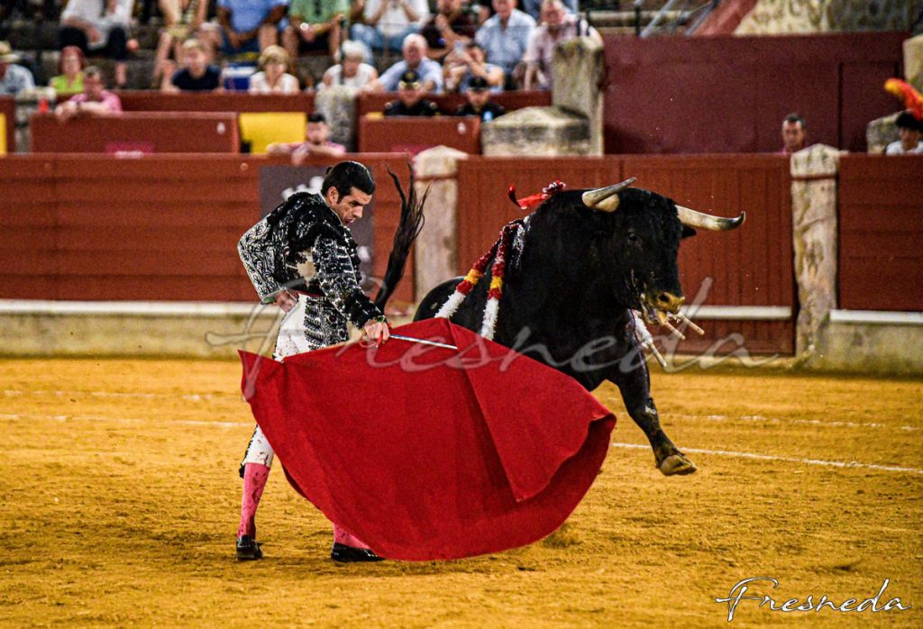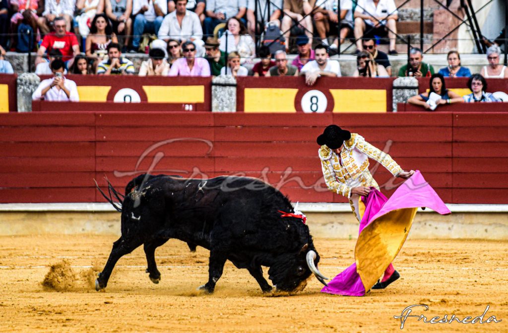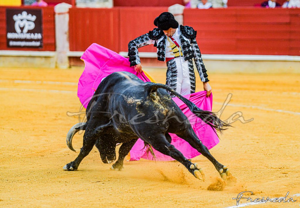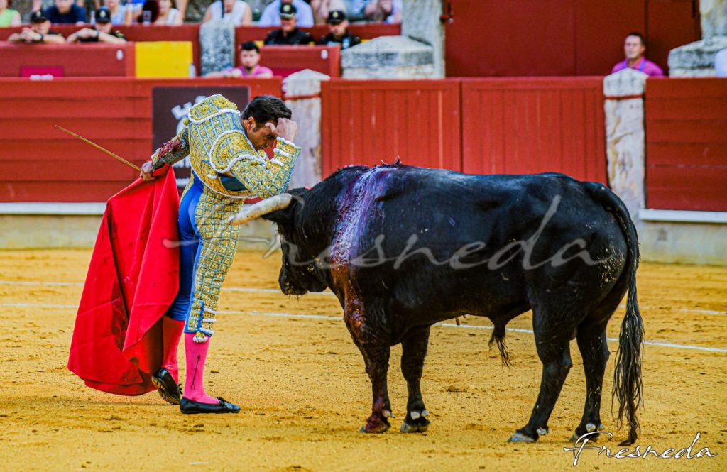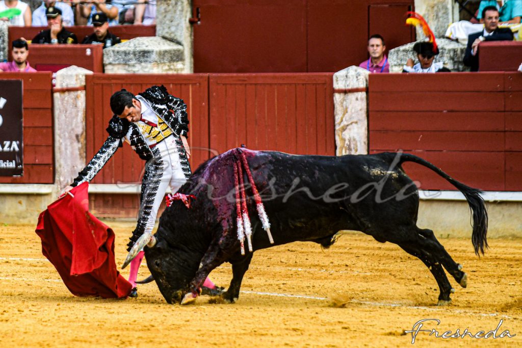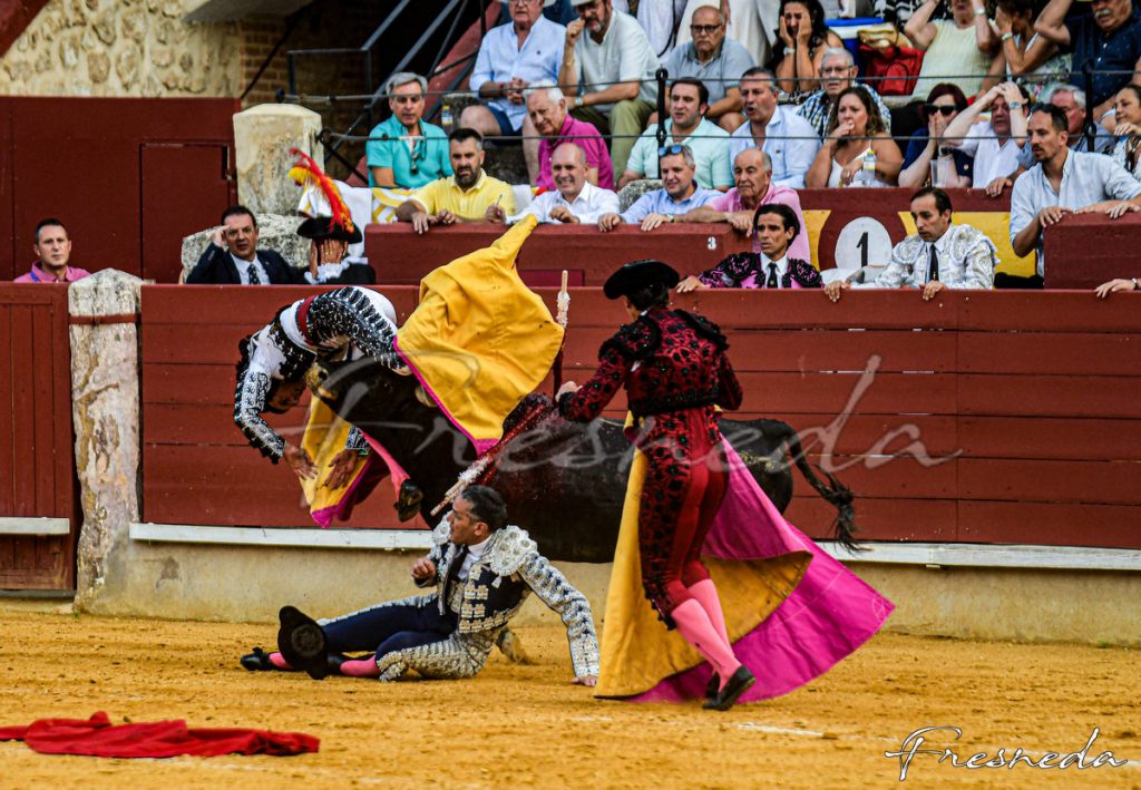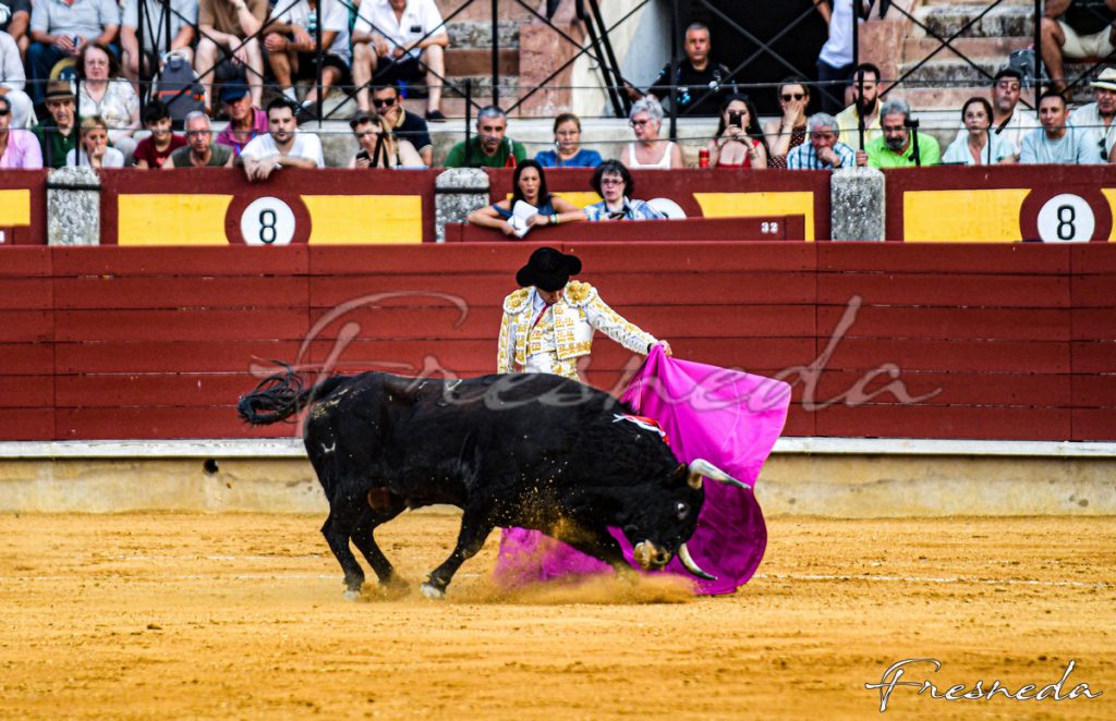 El torero extremeño le dio réplica con entrega y plasticidad hasta coger la mano izquierda y comprobar que el fuelle de su oponente había menguado notablemente. Al entrar a matar resultó cogido dramáticamente, volando por los aires pasando de pitón a pitón.