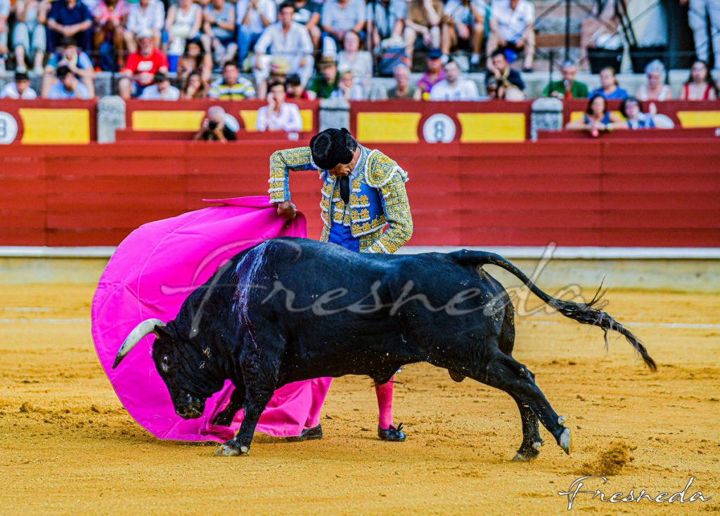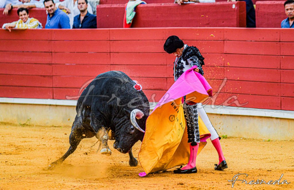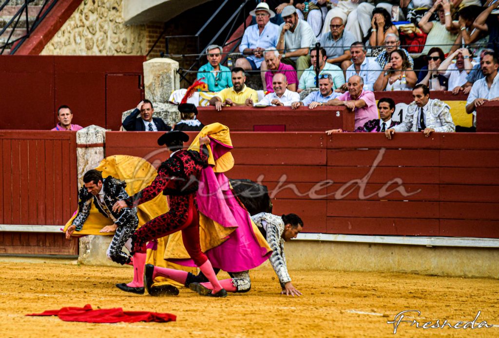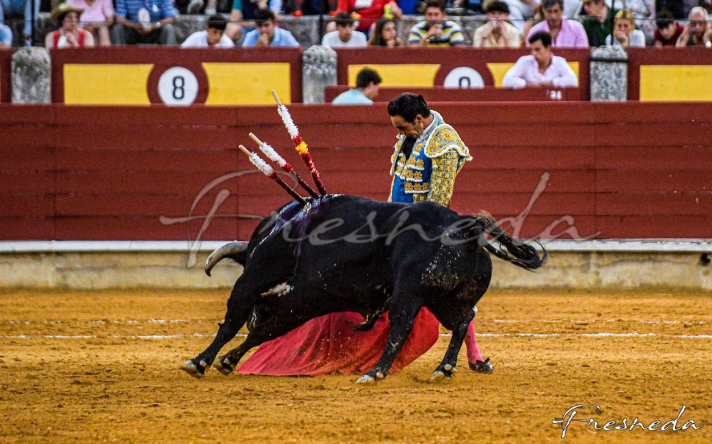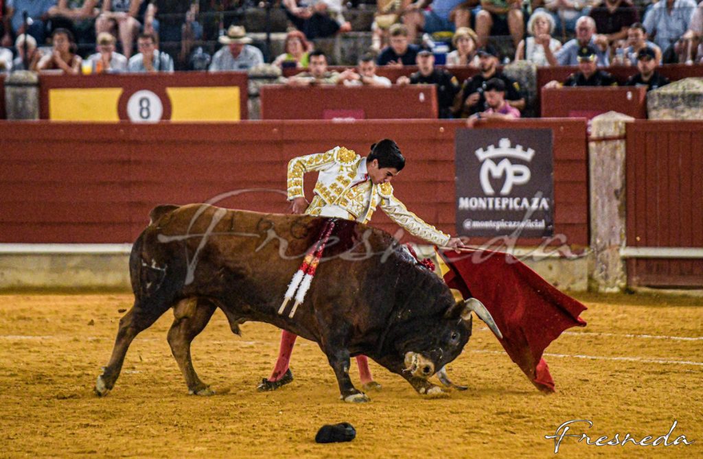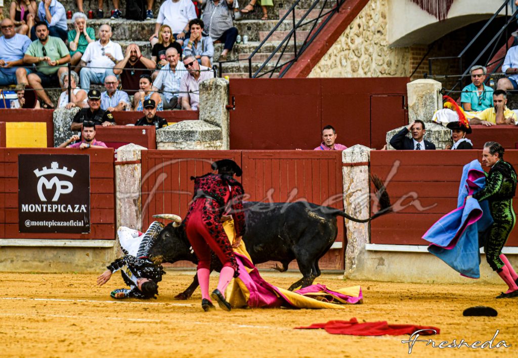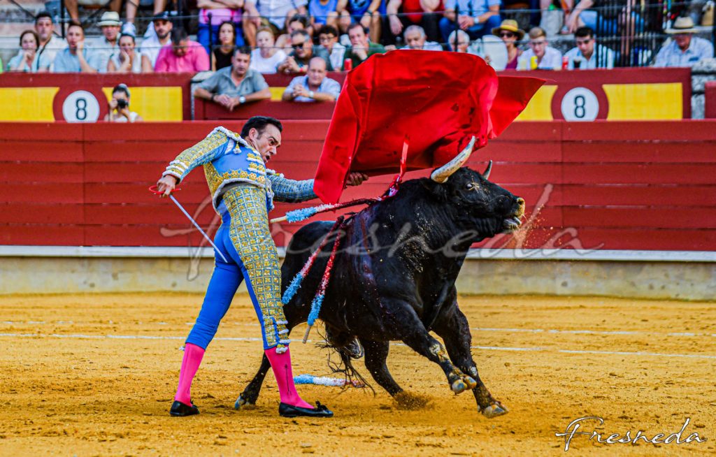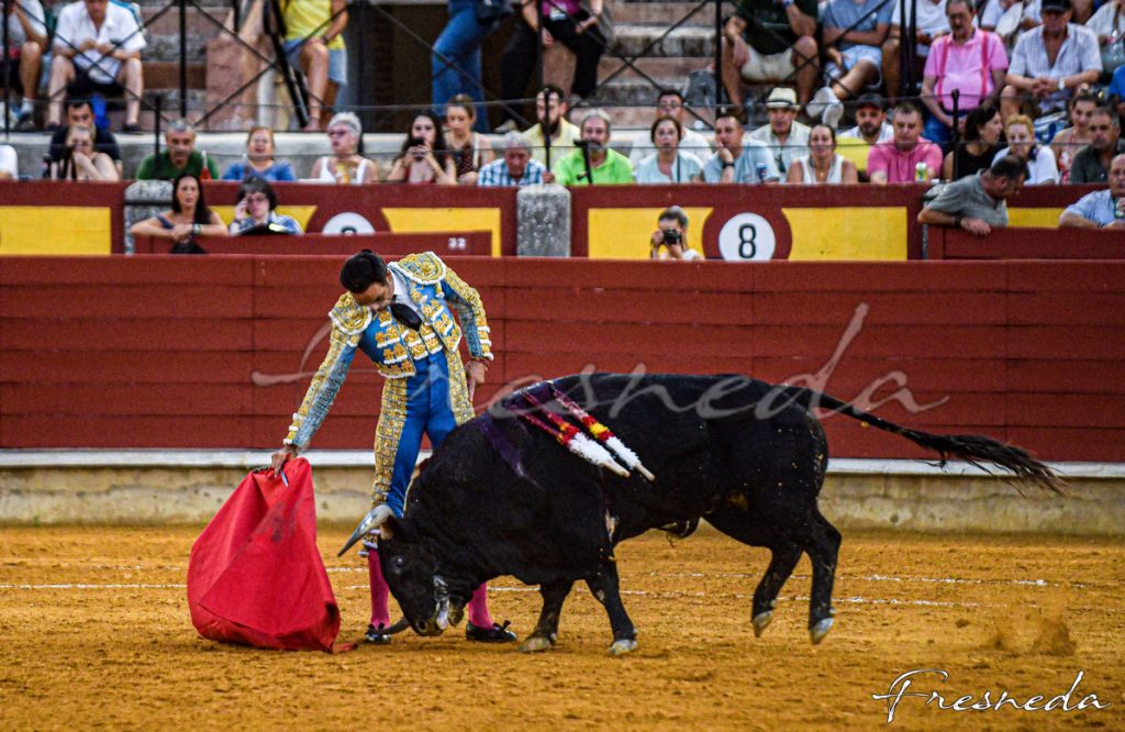 El torero extremeño le dio réplica con entrega y plasticidad hasta coger la mano izquierda y comprobar que el fuelle de su oponente había menguado notablemente. Al entrar a matar resultó cogido dramáticamente, volando por los aires pasando de pitón a pitón.