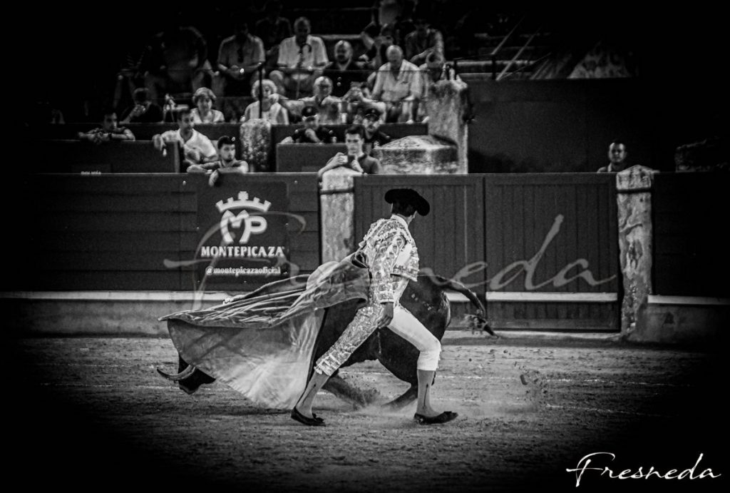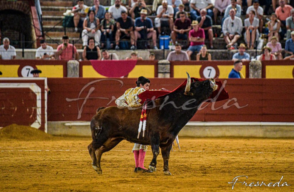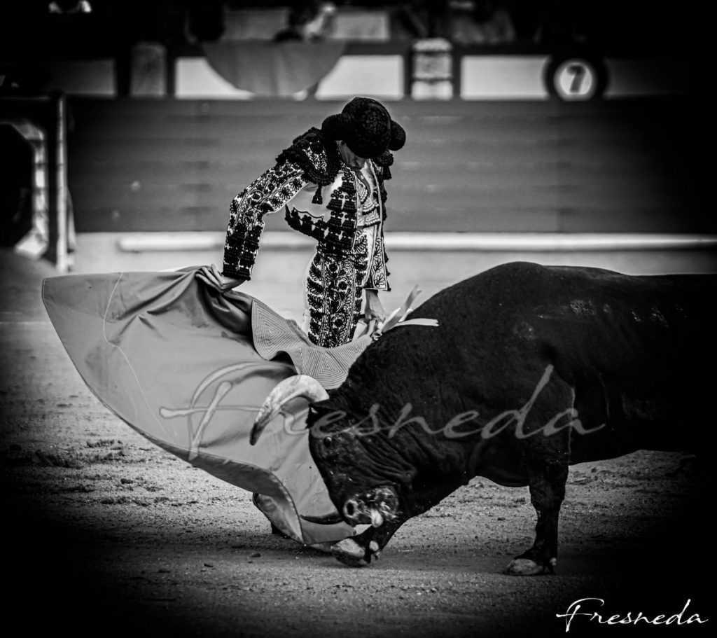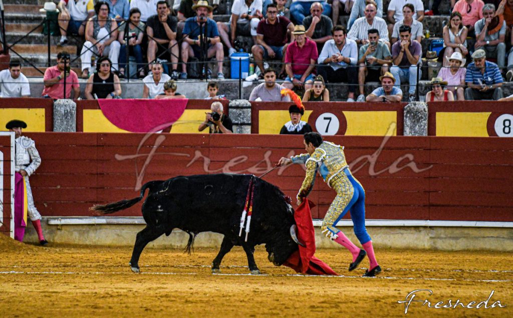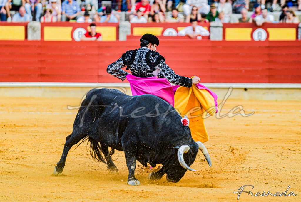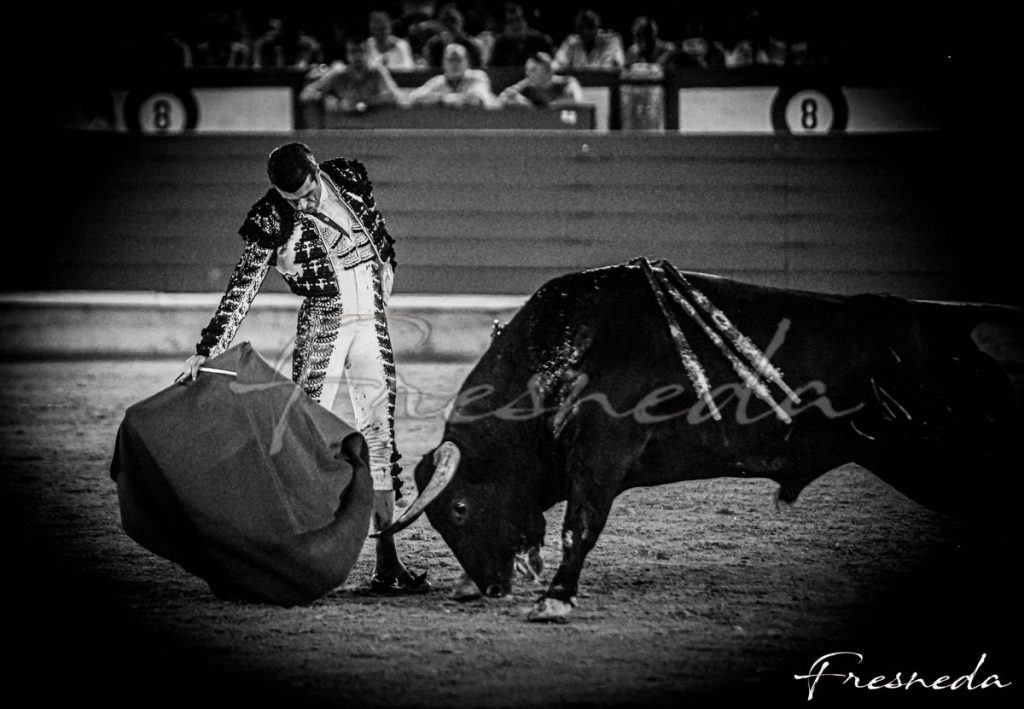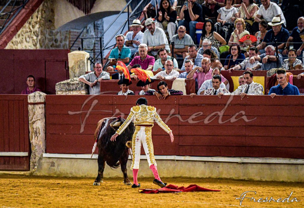 El torero extremeño le dio réplica con entrega y plasticidad hasta coger la mano izquierda y comprobar que el fuelle de su oponente había menguado notablemente. Al entrar a matar resultó cogido dramáticamente, volando por los aires pasando de pitón a pitón.