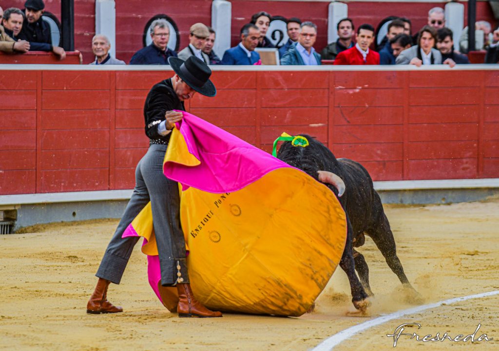 El segundo, de Daniel Ruiz, tuvo nobleza y buena condición en sus primeras embestidas, aunque se mostró medido de fuerzas. Enrique Ponce, midiendo distancias y alturas, consiguió cuajar dos series iniciales sobre la mano derecha basadas en la ligazón. Por el pitón izquierdo, el animal fue más complejo, ya que le faltó transmisión, siendo los muletazos de uno en uno. Una faena meritoria y llena del gusto y la estética que atesora el torero valenciano, que acabó con sus famosas poncinas y unos remates por abajo. Dejó una estocada trasera y caída fulminante.
