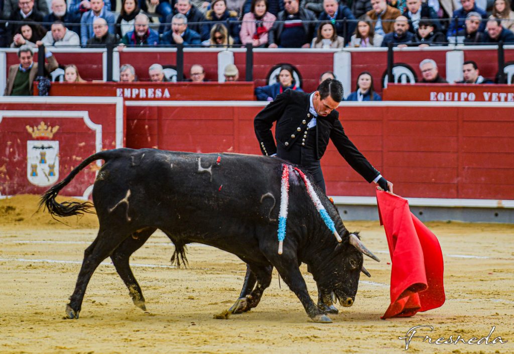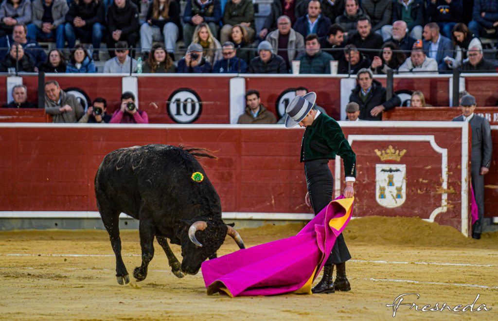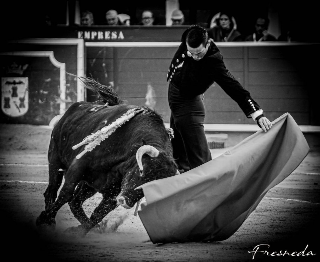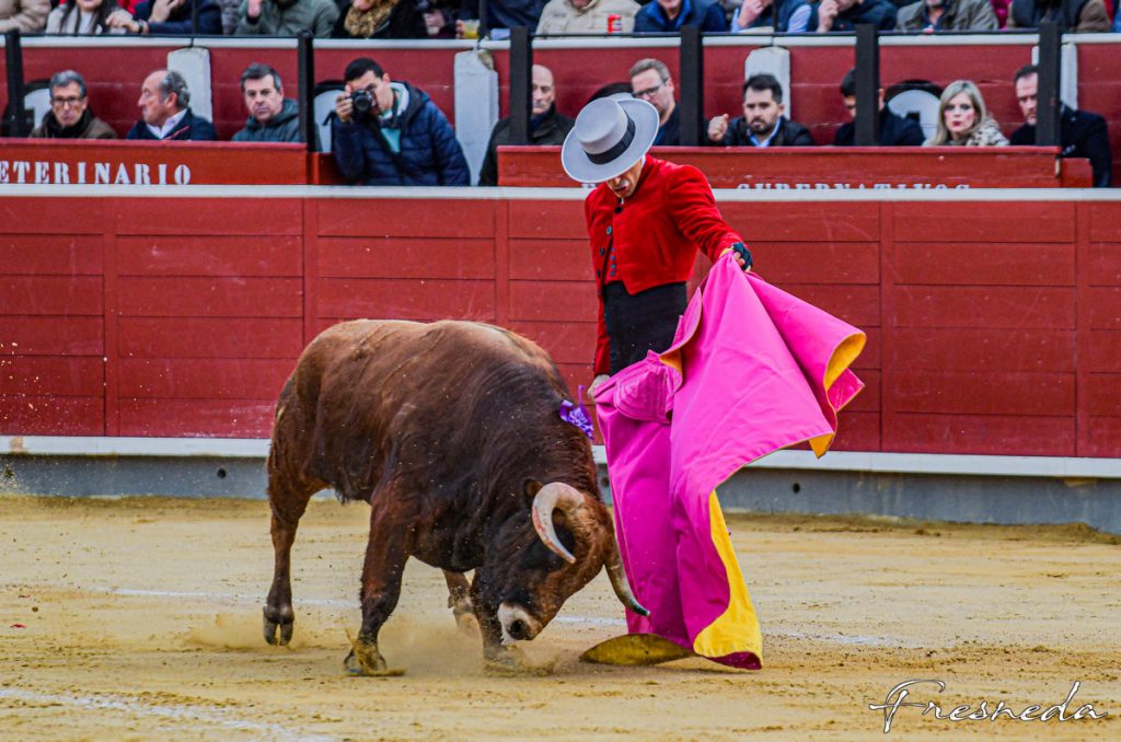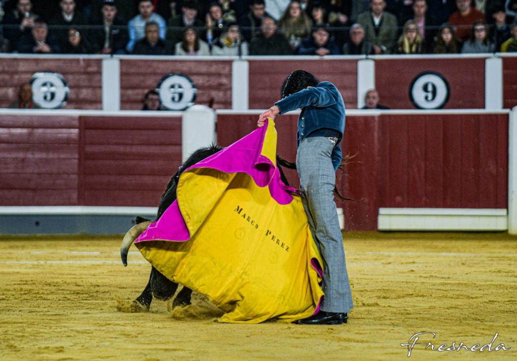Abanto de salida el sexto de la tarde, al que toreó Marco Pérez por delantales muy despacio, rematando con una buena media. Inició la faena el salmantino con unos pases con la pierna flexionada, un trincherazo y un pase de pecho que ya calaron en los tendidos. El utrero, noble pero falto de transmisión y agarrado al piso, no ayudó en nada a la labor del salmantino, que mostró capacidad y esa madurez que atesora, aprovechando las pocas cualidades al animal. Plasmó un toreo encajado, hondo y profundo, cuajando al de Talavante por ambos pitones, y rematando la faena en el terreno de las cercanías. Muy por encima de su oponente. Estocada casi entera en todo lo alto. Dos orejas y rabo.