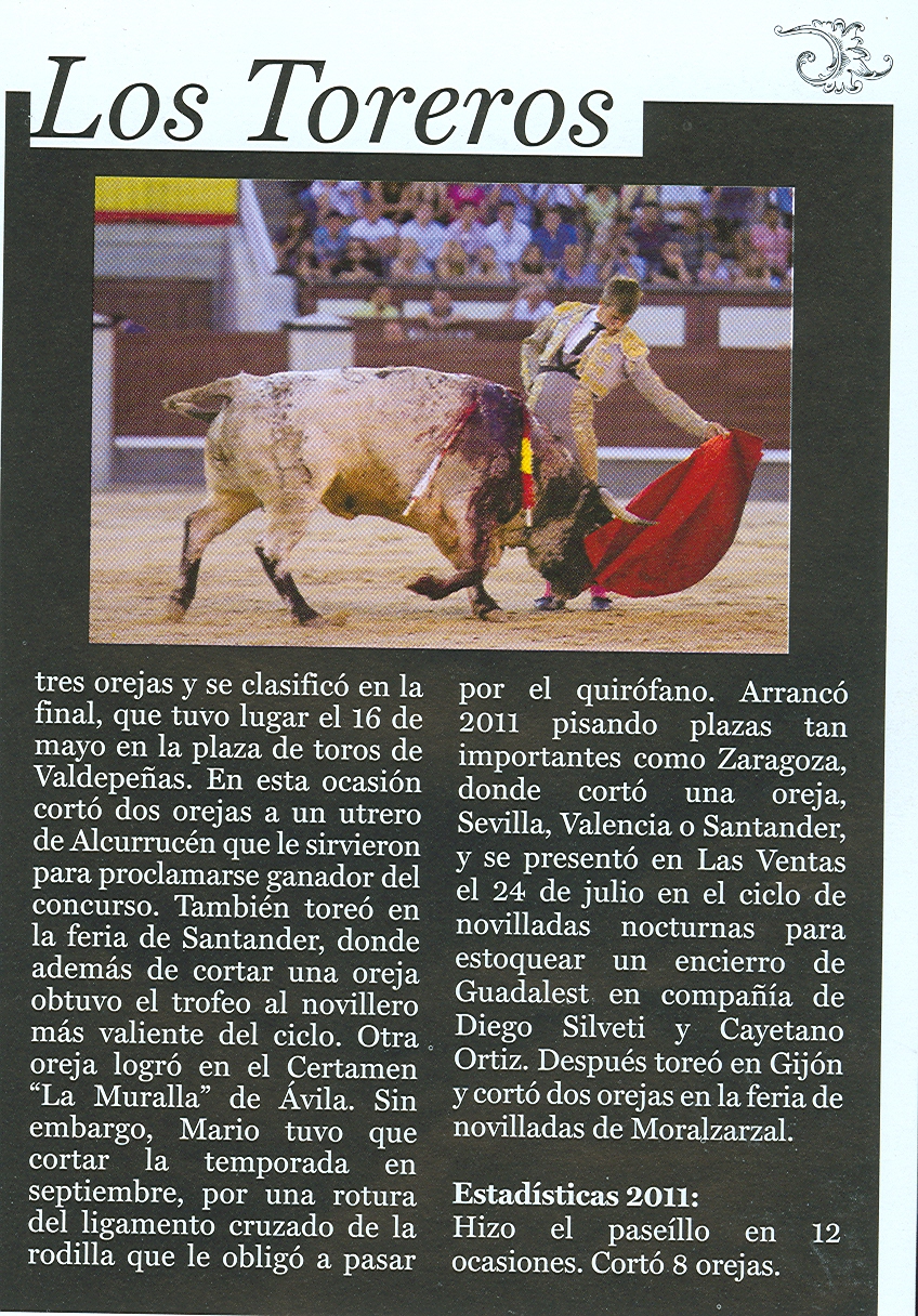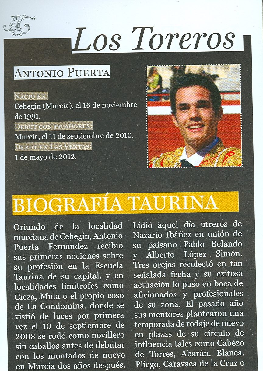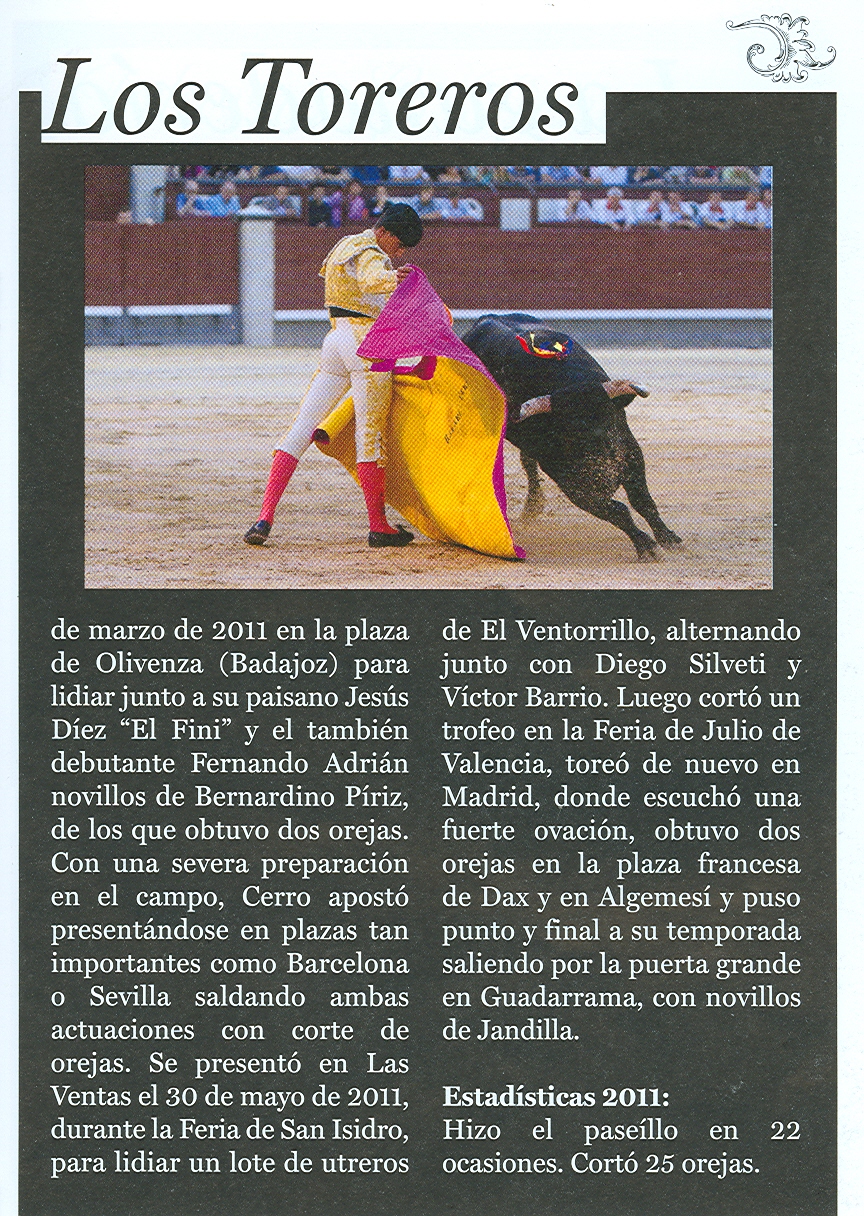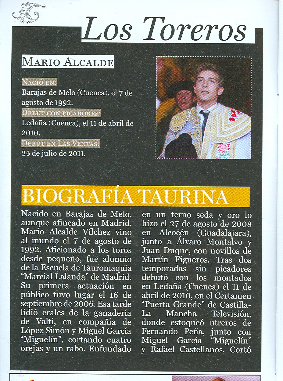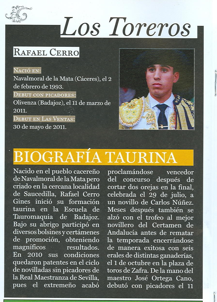 Dieron cuenta del referido encierro, el conquense Mario Alcalde, el muciano de Cehgil, Antonio Puerta que hizo su presentación y el cacereño Rafael Cerro. Este trío de toreros anduvo bien con el capote y la muleta, sumando buenos momentos. Pero a la hora de matar demostraron un desacierto total, por ese vicio impuesto en la torería actual por los diestros ventajistas, que han ganado buen dinero mistificando la suerte de matar, llamada la «suerte suprema», la «hora de la verdad» y «la que da y quita». La mayoría de los matadores actuales ejecutan la suerte de matar jugando mal la muleta, cuando antes se decía que la