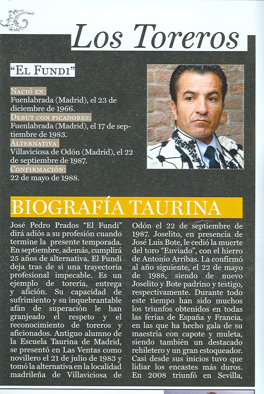 Devuelto al corral el primero por falta de fuerza salió un sobrero de don José Luis Iniesta. El conjunto de los toros lidiados cumplieron en varas y se dejaron pelear. Dieron cuenta de ellos José Pedro Prados «El Fundi», Sergio Aguilar y Jesús Martínez Barrios «Morenito de Aranda». Los diestros alargaron demasiado las faenas de muleta aunque con la espada se les vio certeros.