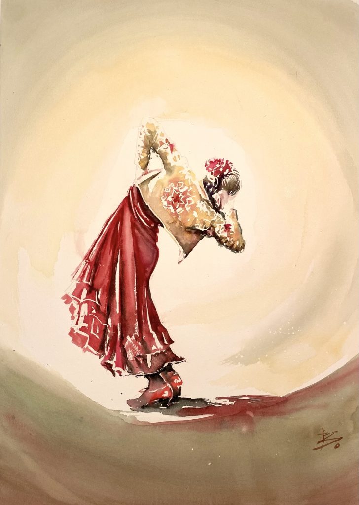 Con una serie de acuarelas y dibujos que intentan representar la espontaneidad y plasticidad de ese momento construye su particular homenaje para estas mujeres que sobre un tablao siguen creando maravillas .