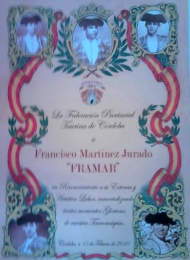 en 2010. Antonio Sanz Llergo (entonces presidente), le impuso la Insignia de Oro de la misma, en una de las sedes que tuvo dicha Federación: el Restaurante que, por entonces, regentaba el valiente ex novillero y posterior subalterno, Antonio David.