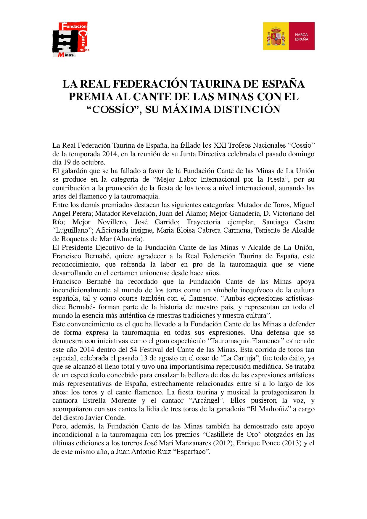 `Fundación Cante de las Minas´ será galardonada con el Trofeo Nacional `Cossio´ – Temporada 2014