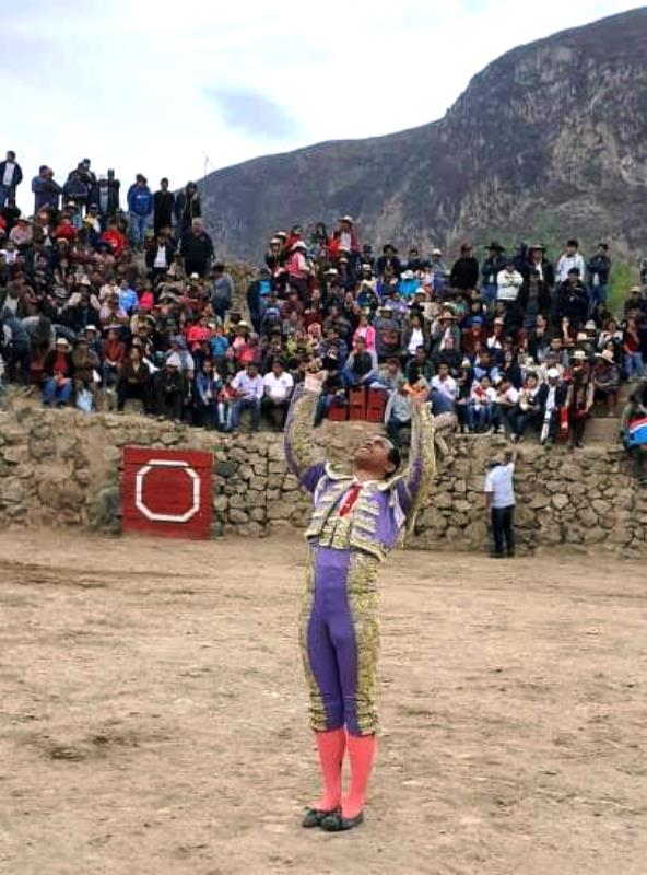 El torero venezolano Gregorio Torres «Maravilla», logra cortarle las dos orejas a un toro de la ganadería de Paco Gutiérrez, en la corrida celebrada en la localidad de San Sebastián de Sacraca perteneciente al municipio Ayacucho en la República del Perú.