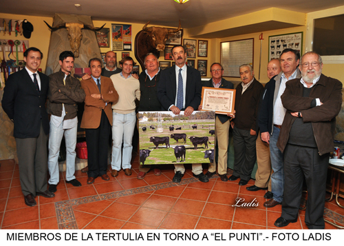 La tertulia no pasó por alto la gentileza de Prieto Garrido de acoger este acto en su casa y le obsequió con un mural fotográfico de una imagen donde se muestran unos toros en la dehesa.