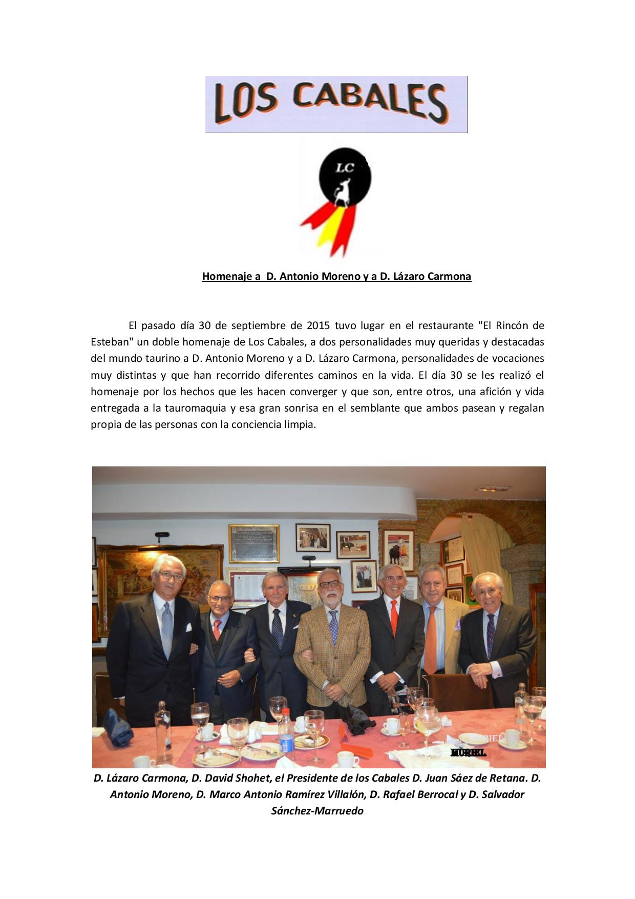 Homenaje a D. Antonio Moreno y a D. Lázaro Carmona en la Peña Taurina `Los Cabales´