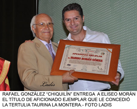 Una vez acabada ésta, tomó la palabra el alcalde Pablo Carrillo y entregó a Eliseo Morán un recuerdo de esta jornada homenaje, quien por fin tuvo la oportunidad de tomar la palabra, para, visiblemente emocionado, agradecer este cariñoso homenaje en el que ha participado una nutrida representación de la gran familia taurina.-