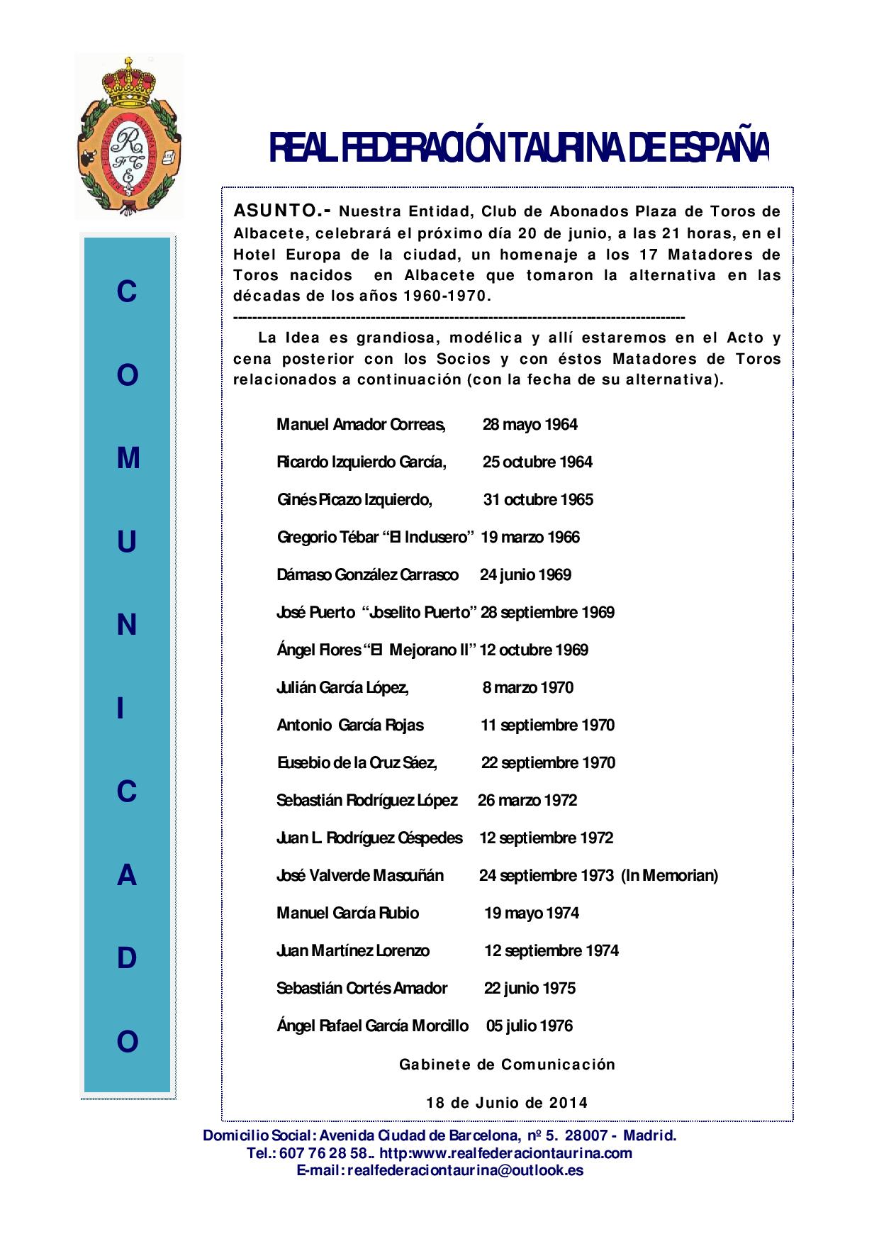 Homenaje a los 17 Matadores de Toros nacidos en Albacete que tomaron la alternativa en las décadas de los años 1960-1970