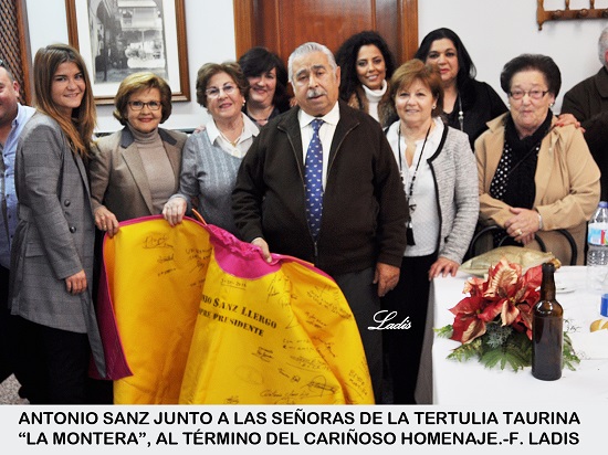 Como resumen añadir que el acto tuvo una organización perfecta, con una comida exquisita y un ambiente muy cariñoso hacia el homenajeado, sin que faltaran algunas simpáticas espontáneas que cantaron fandangos y otros palos flamencos. Un buen ambiente al que contribuyó el montaje audiovisual del Catedrático de la UCO Aniceto Méndez, un paseo gráfico de la inmensa labor desarrollada por el homenajeado al frente de la Federación. Por su parte, la joven Pilar Guil, presidenta del Aula del Toro, entregó, en nombre de la organización, un ramo de flores a Conchi López, esposa de Antonio Sanz. En resumen, un acto simpático en el que tuve el honor de ser su mantenedor y glosar la figura de mi querido y admirado amigo Antonio Sanz Llergo.
