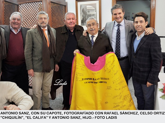 Antonio Sanz recibió, como recuerdo de este día, un capote de brega firmado por todos los presentes con la inscripción «Antonio Sanz Llergo: Siempre Presidente».