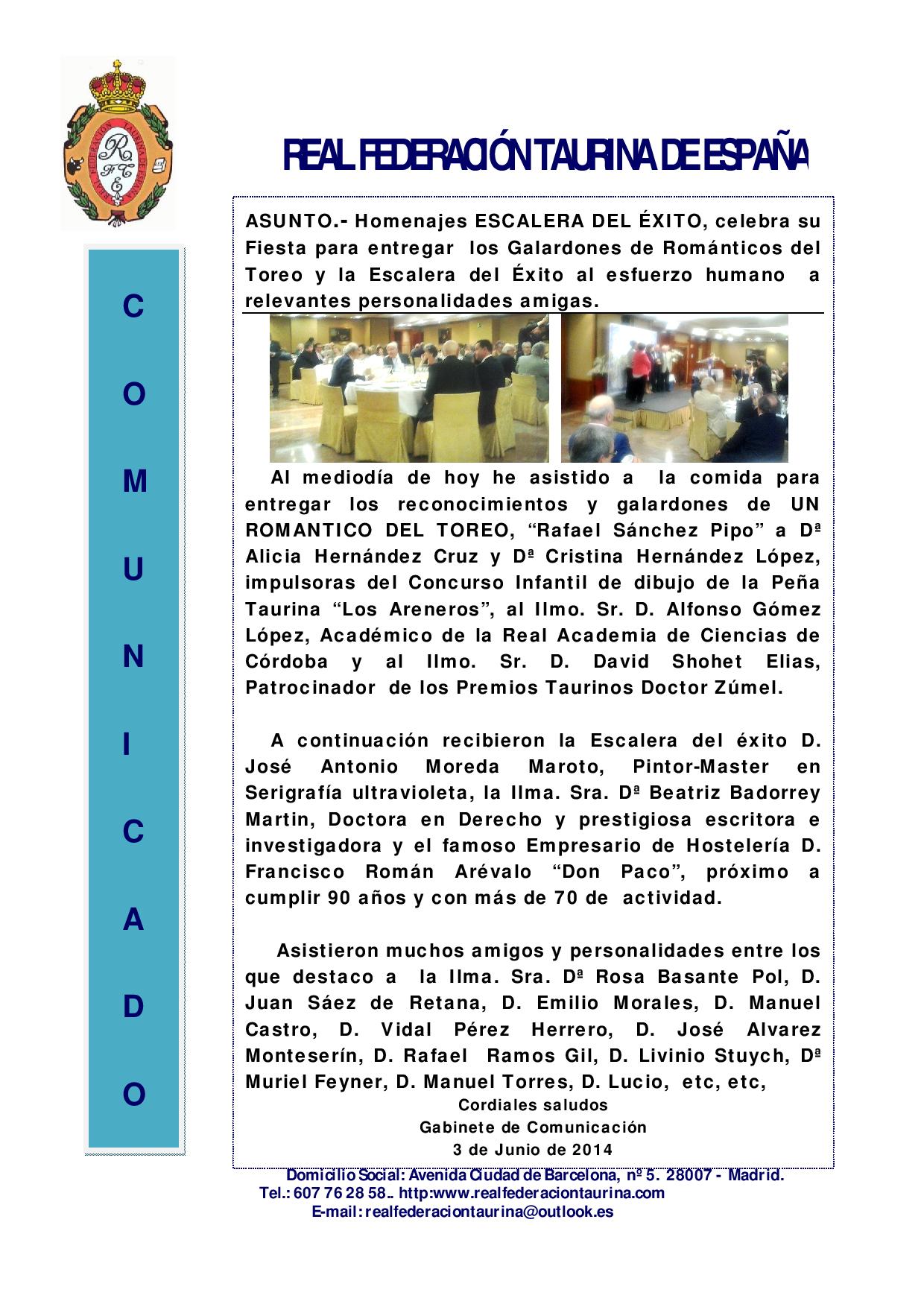 Homenajes ESCALERA DEL ÉXITO entrega los Galardones de Romántico del Toreo y Escalera del Éxito al esfuerzo humano a relevantes personalidades