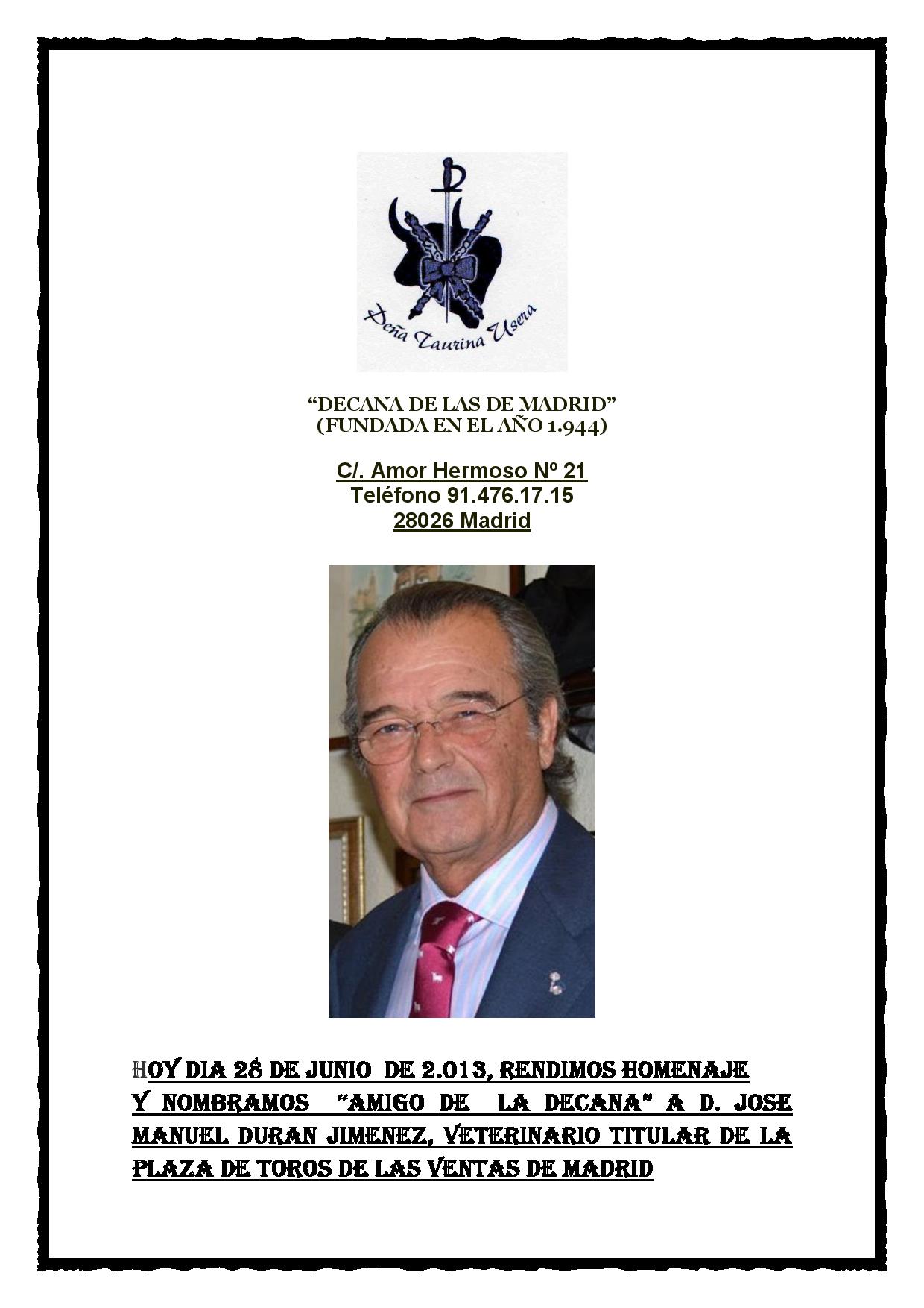 Hoy 28 de junio, la Peña Taurina Usera rendirá homenaje a Don José Manuel Durán Jiménez. Escalera del Éxito 185