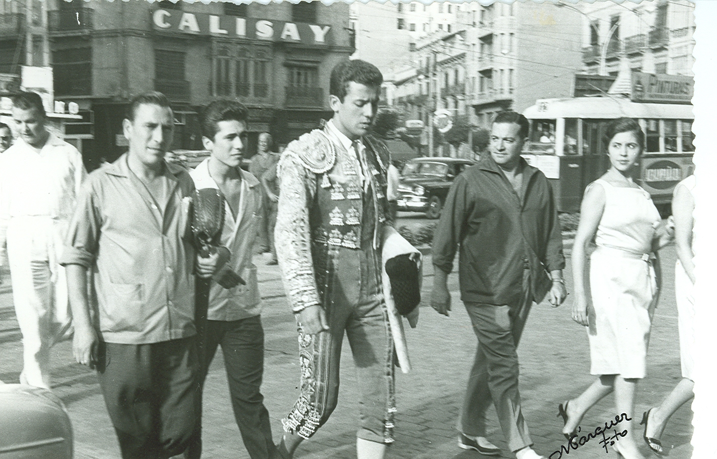 José Mª Montilla dirigiéndose a la Plaza de Toros de Valencia, detrás su mozo de espada y Salvador Sánchez – Marruedo, su apoderado.