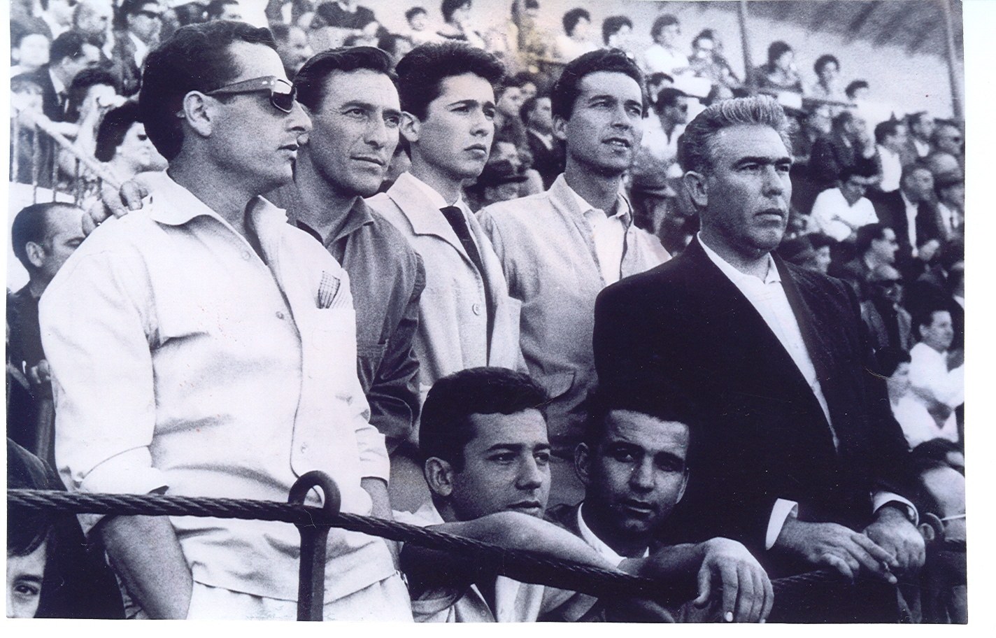 De pie en el centro, Pino, su mozo de espadas y Salvador Sánchez – Marruedo con dos amigos. En barrera, José Mª Montilla, con otro amigo y de pie, José Sánchez Ortiz, hermano de Rafael Sánchez “Pipo” y tío de Salvador en la Plaza de toros de Córdoba.