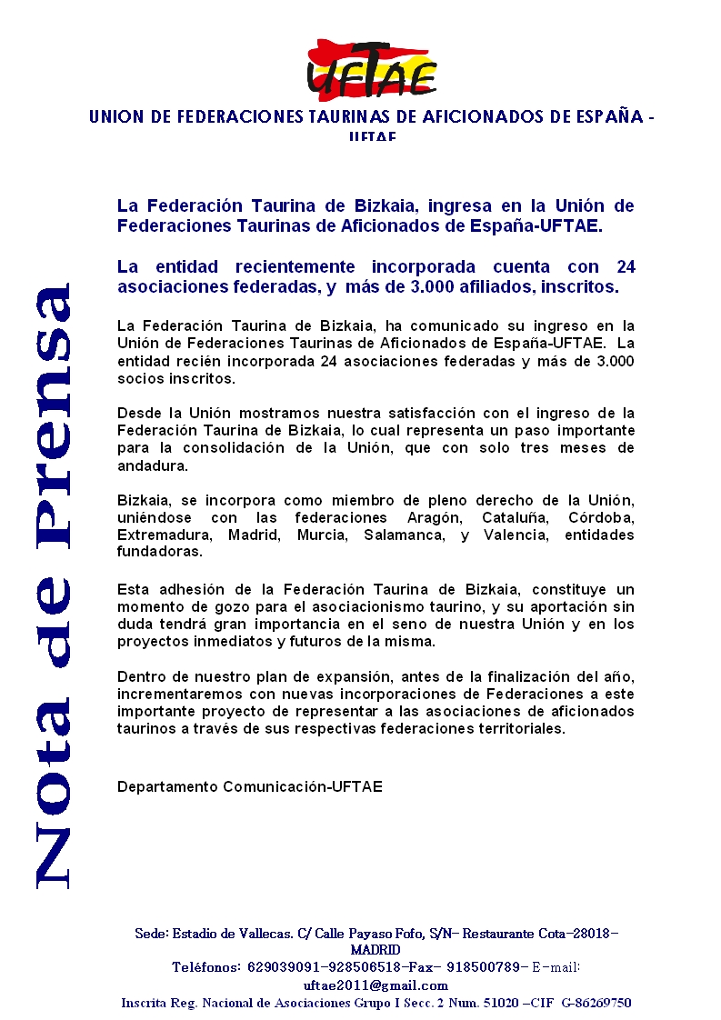Ingreso Federacion Taurina de Bizkaia en la UFTAE
